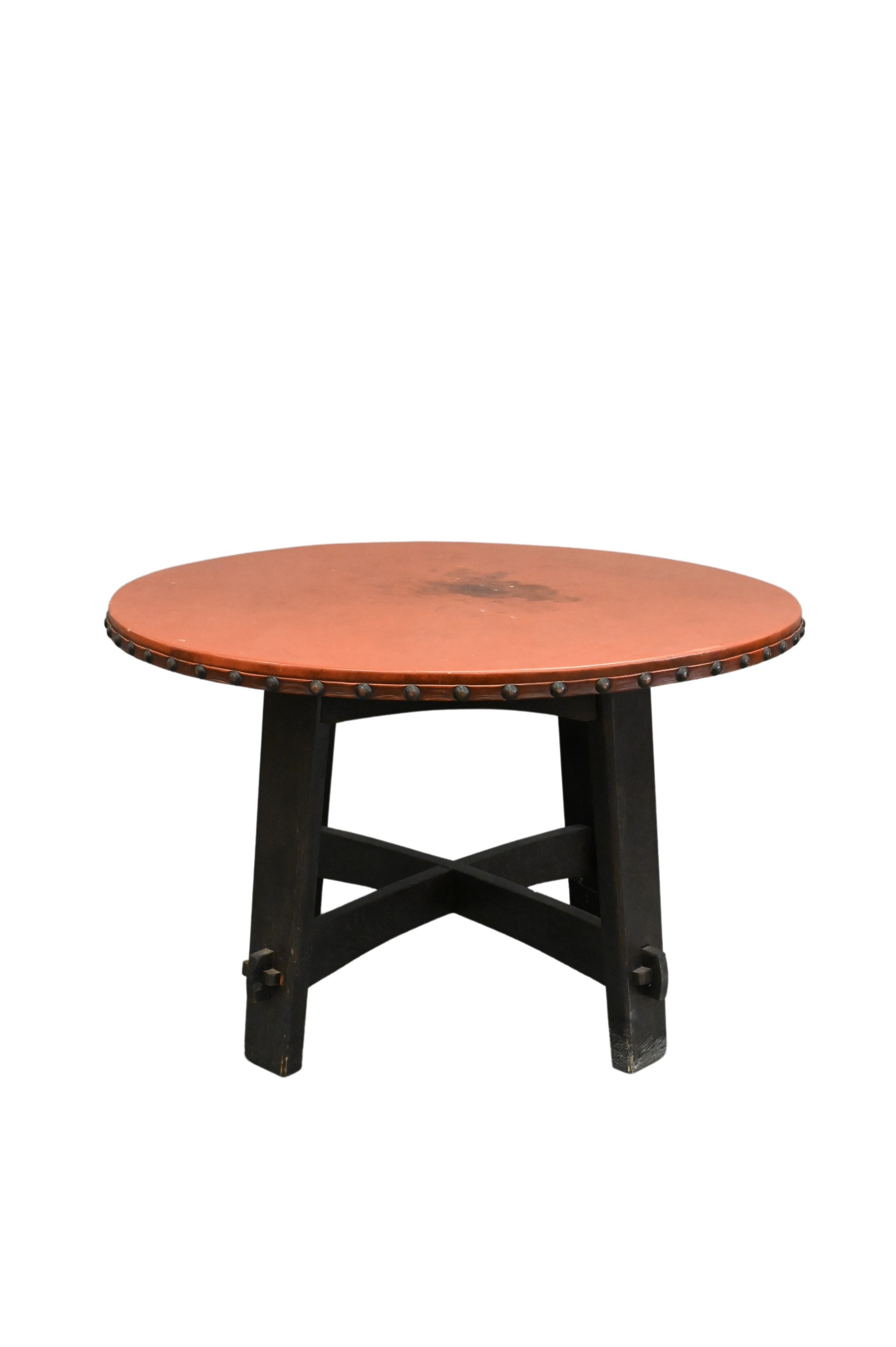 oak and leather with hand wrought iron tacks, executed by the Craftsman Workshops Gustav Stickley, Eastwood, New York,