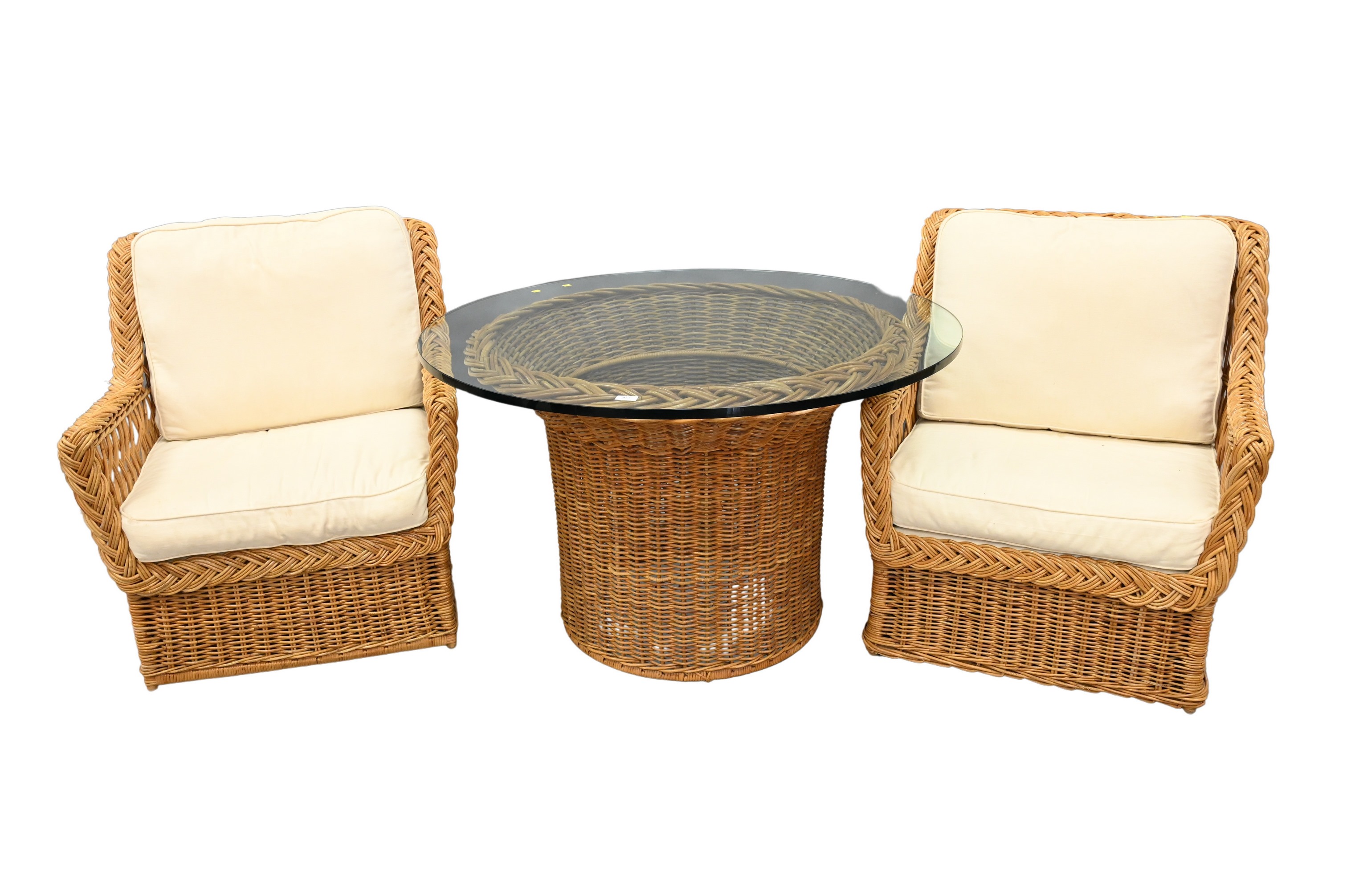 to include a pair of oversized club chairs with cushions, along with a matching round glass top table