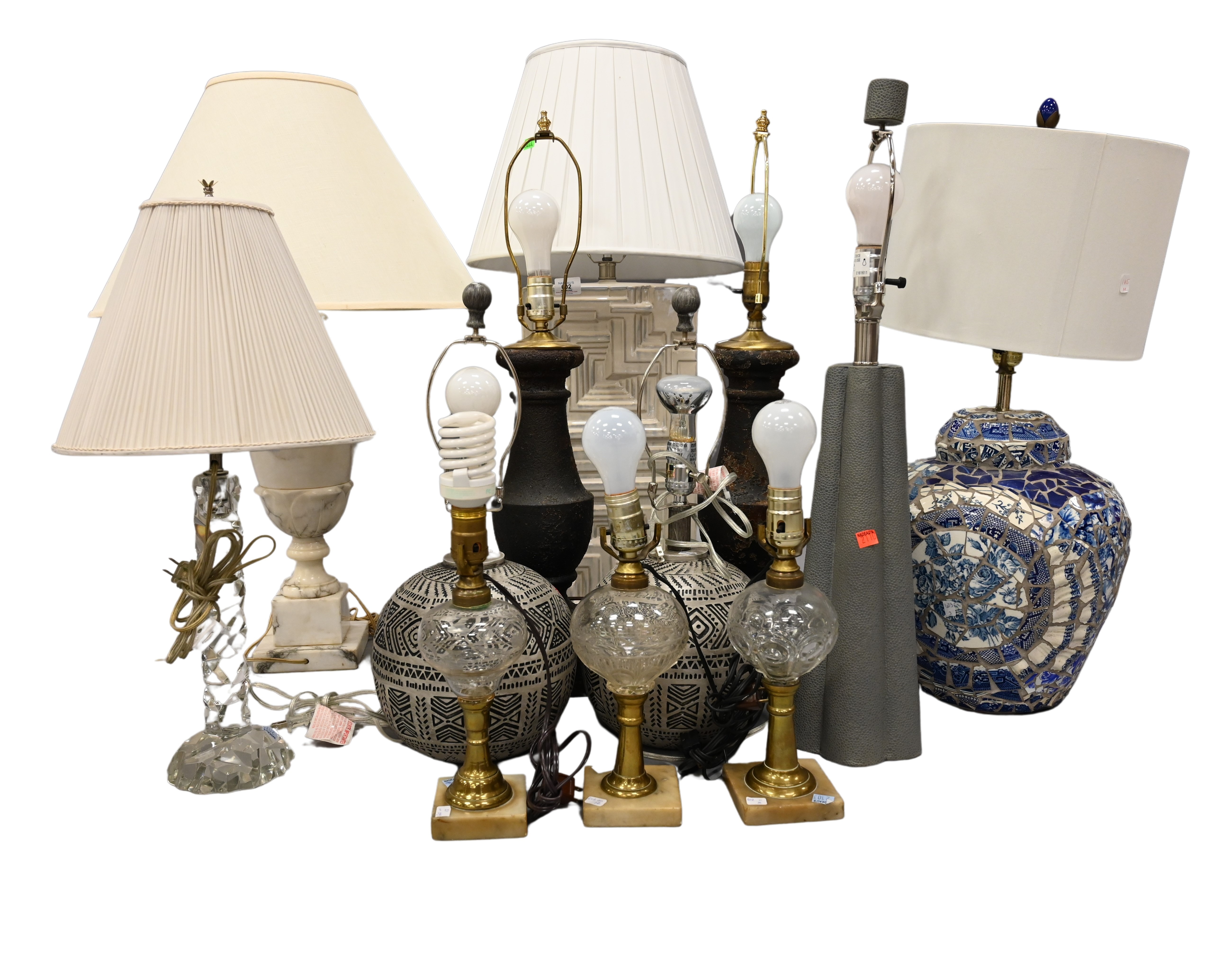 set of 12 cut glass stem wine glasses clear with diamond cut patterns, glass height 4 inches, group of six ornate vases to include large royal blue and gilt handled vase, two floral vases, one eastern mache, one glass oriental , one pedestal vase, tallest vase 25 inches, eight piece group of plaster figures to Include, John Rogers “Taking the Oath and Drawing Rations”, hidden vase, calendi Bacchic Putti Group, Austin Production “Sultry Awakening”, tallest figure 23 inches, as well as a group of five lamps to include pair of brass urn form lamps, pair of glass on lucite base lamps, along with brass lamp having four candelabra arms, tallest lamp 42 inches