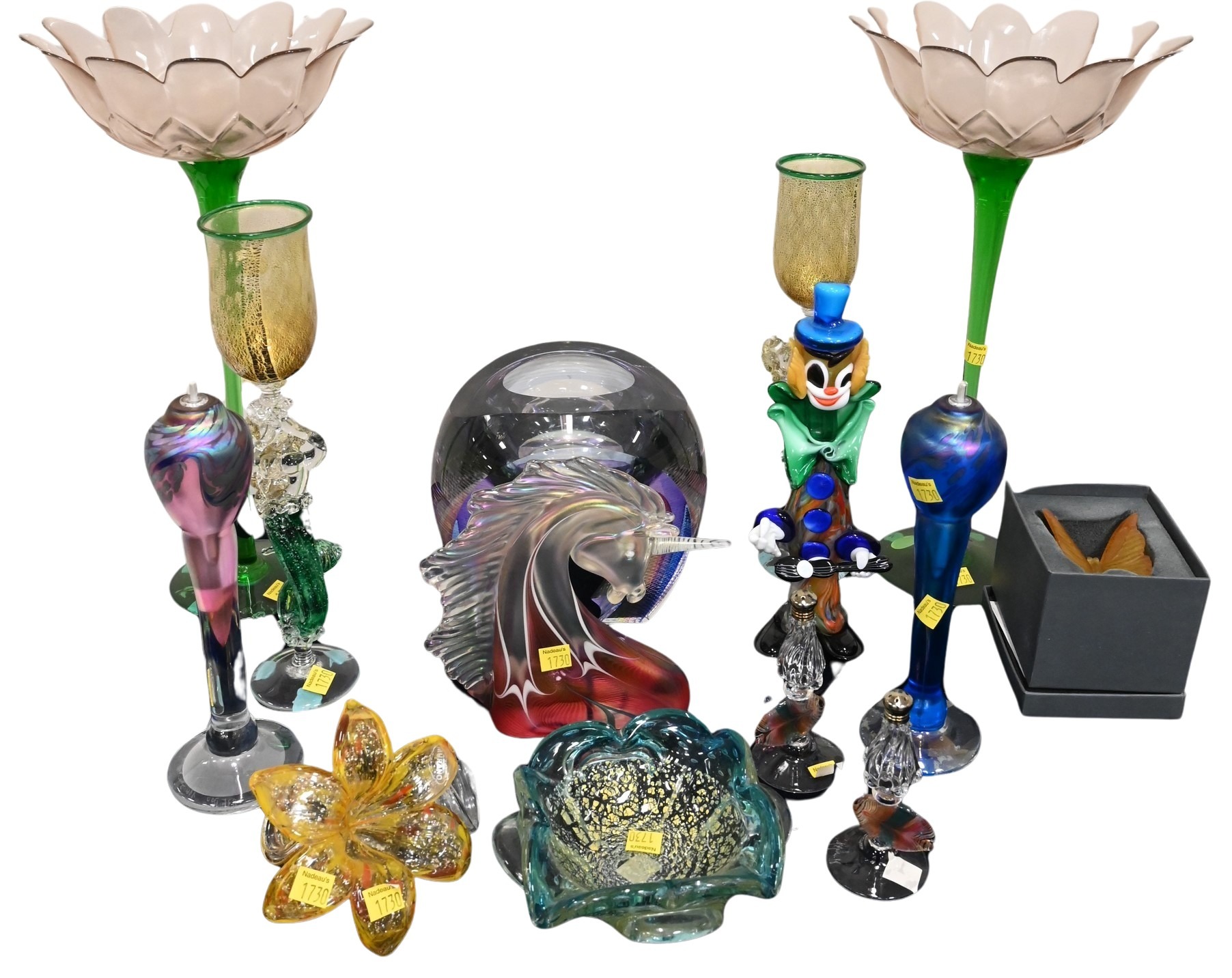 to include a Stuart Abelman Unicorn, two Brian Maytum oil lamps, marked on verso, a pair of flower vases, a rainbow glass vase, a pair of Murano mermaid glasses etc…