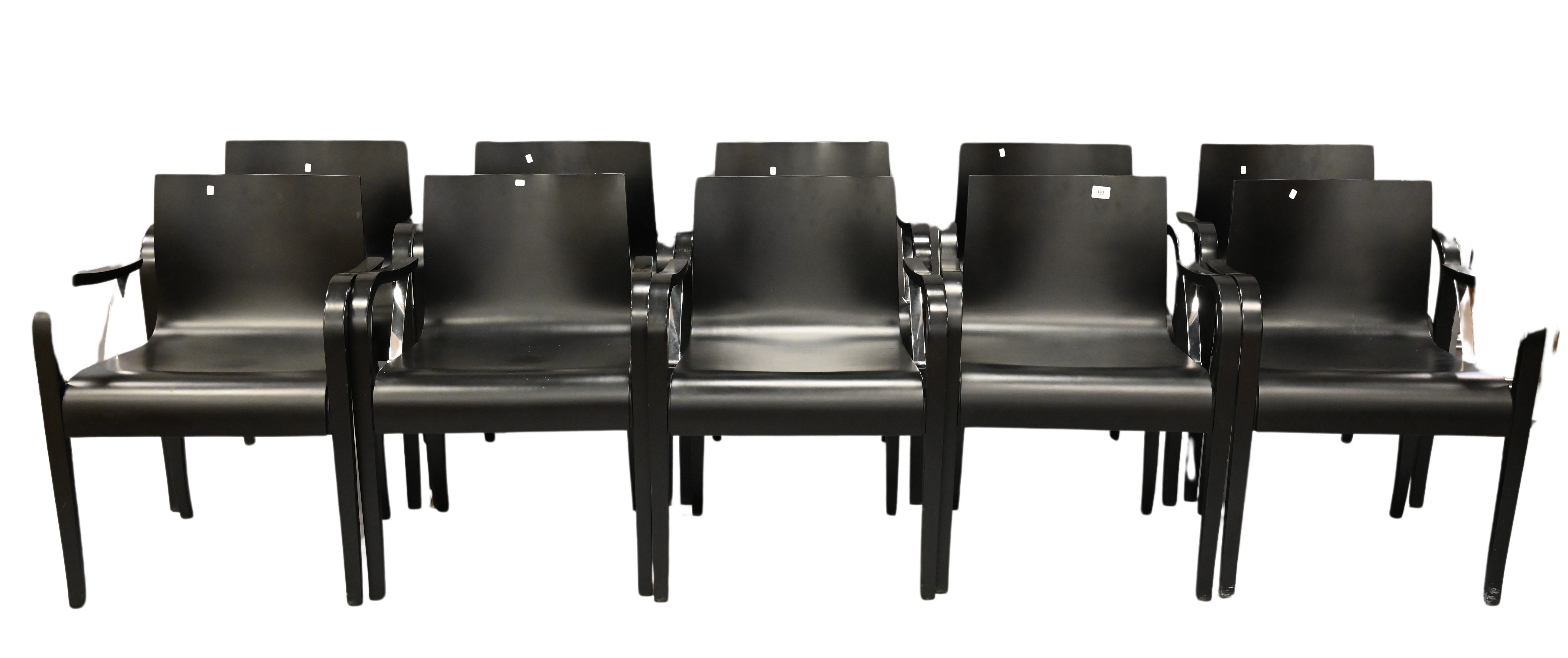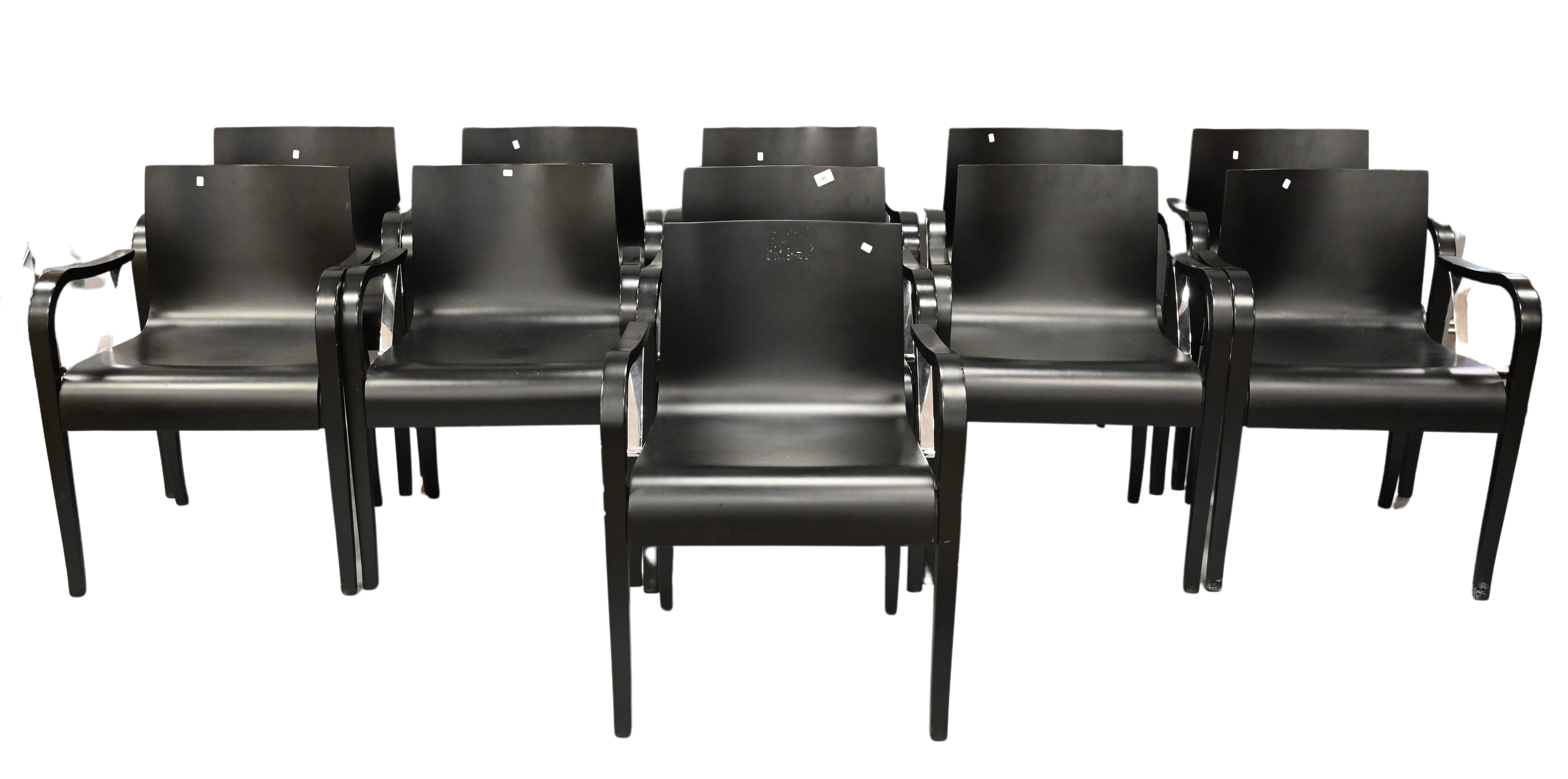 to include a set of 12 black glass luncheon plates along with one large serving plate, signed Lalique France on bottom