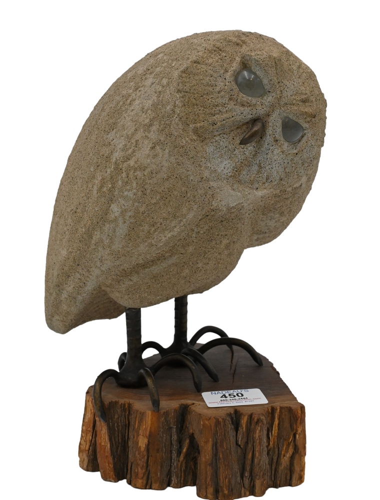 Lou Rankin (1929 – 2016), stone sculpture of an owl on iron legs, mounted on wood base and glass eyes, signed L. Rankin 63 on bottom, height 11 1/4 inches.