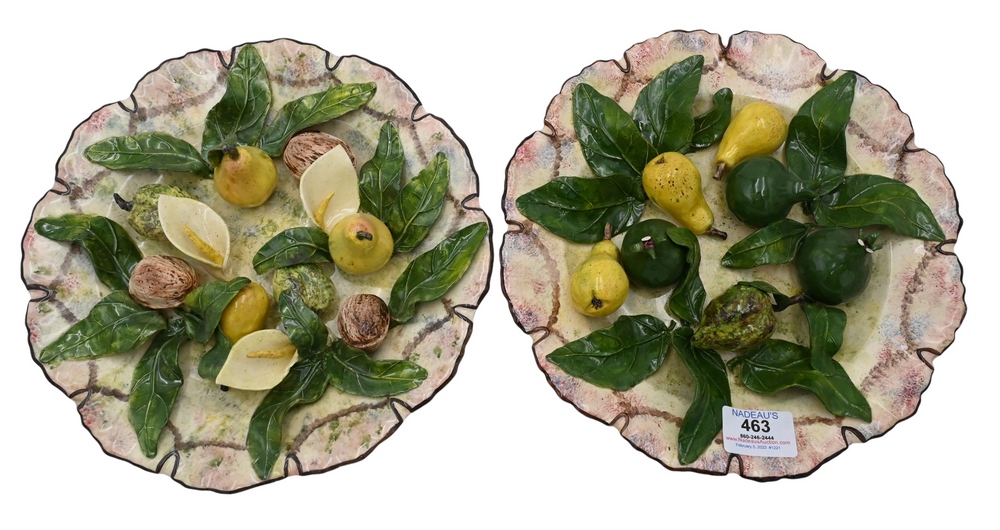 Two Christine Viennet Ceramic Plates, having fruit, vegetable, leaves, flowers and nuts, signed Christine Viennet, France on back, diameter 10 inches, (small chips).