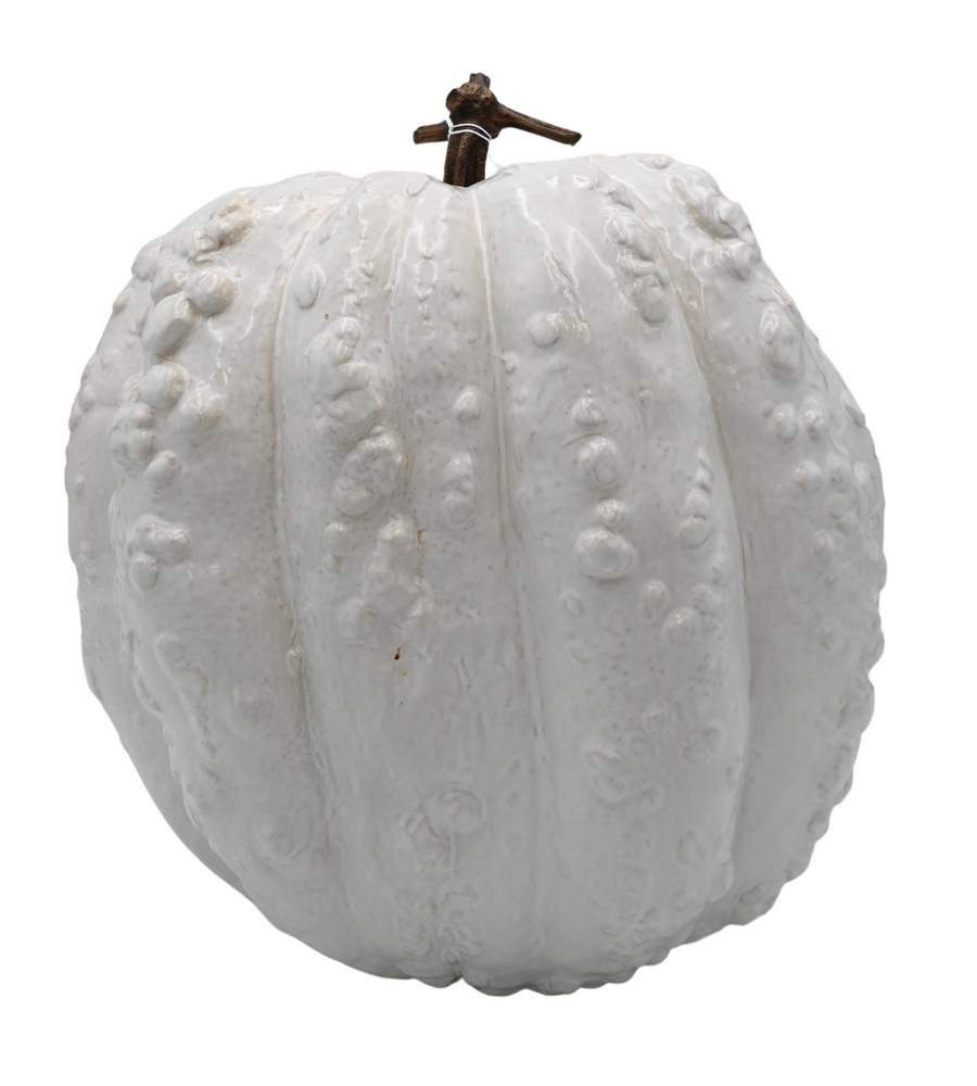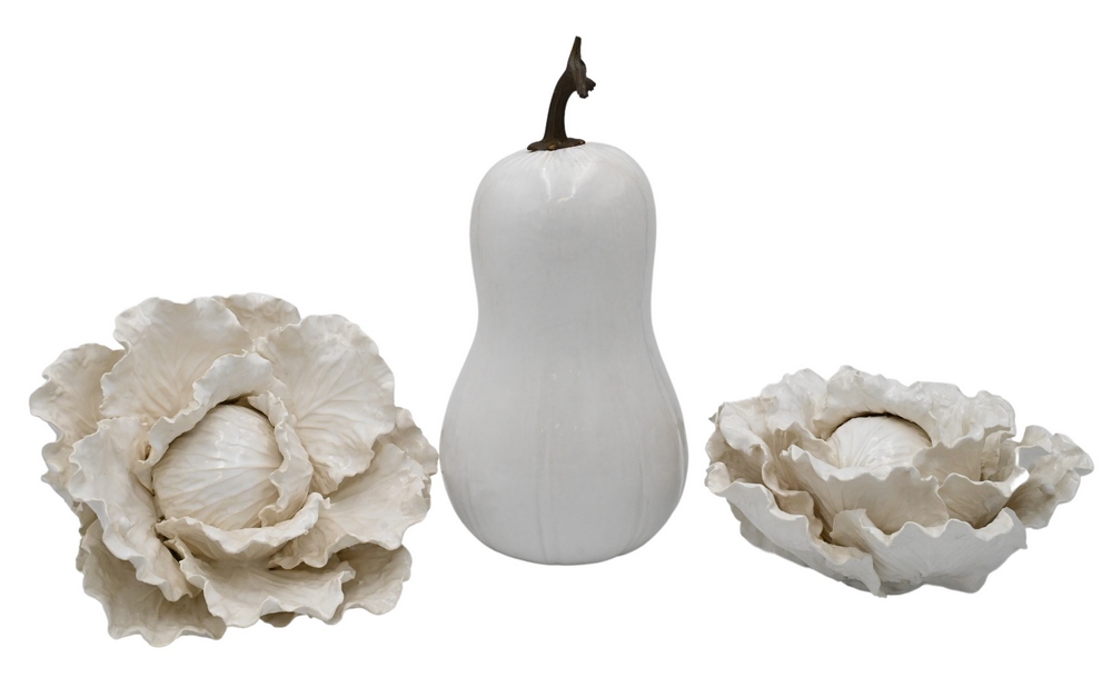 Jean-Paul Gourdon (b. 1956), white glazed ceramic cauliflower along with another white glazed cauliflower that is unsigned (repaired), and an eggplant with bronze stem signed on bottom, height 13 inches.