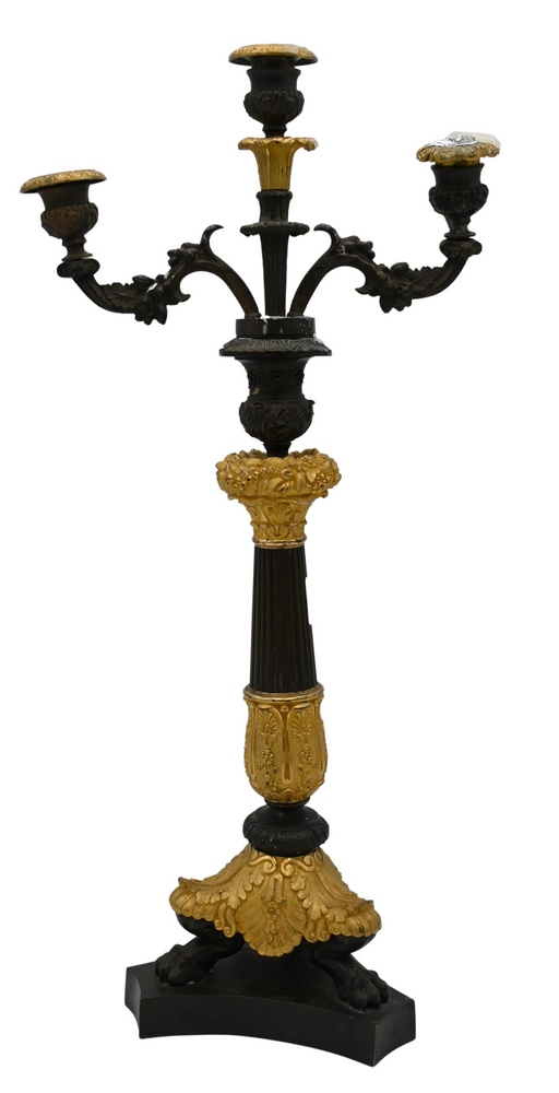 French Empire Gilt and Patinated Bronze Candelabra, having two arms with center candle holders on tripod claw foot base, (missing arm), height 20 inches.