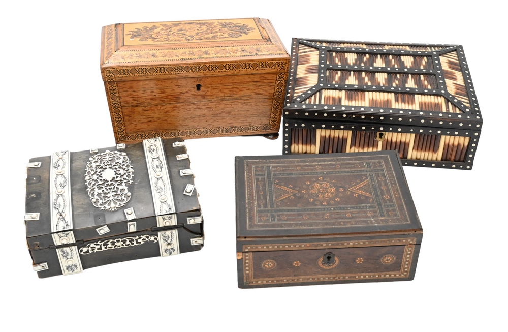 Group of Four Boxes, to include quill box, inlaid tea box, copper inlaid box, along with a small dome top box; quill box height 2 3/4 inches, top 6 1/2 ” x 8 1/2″.