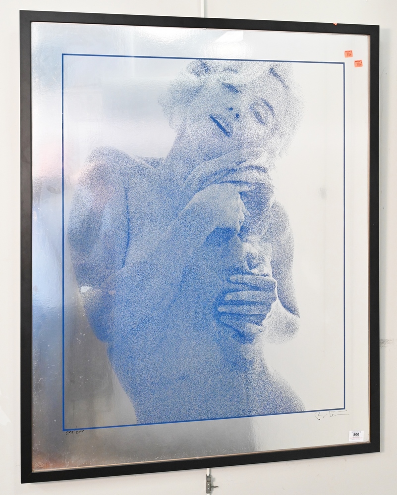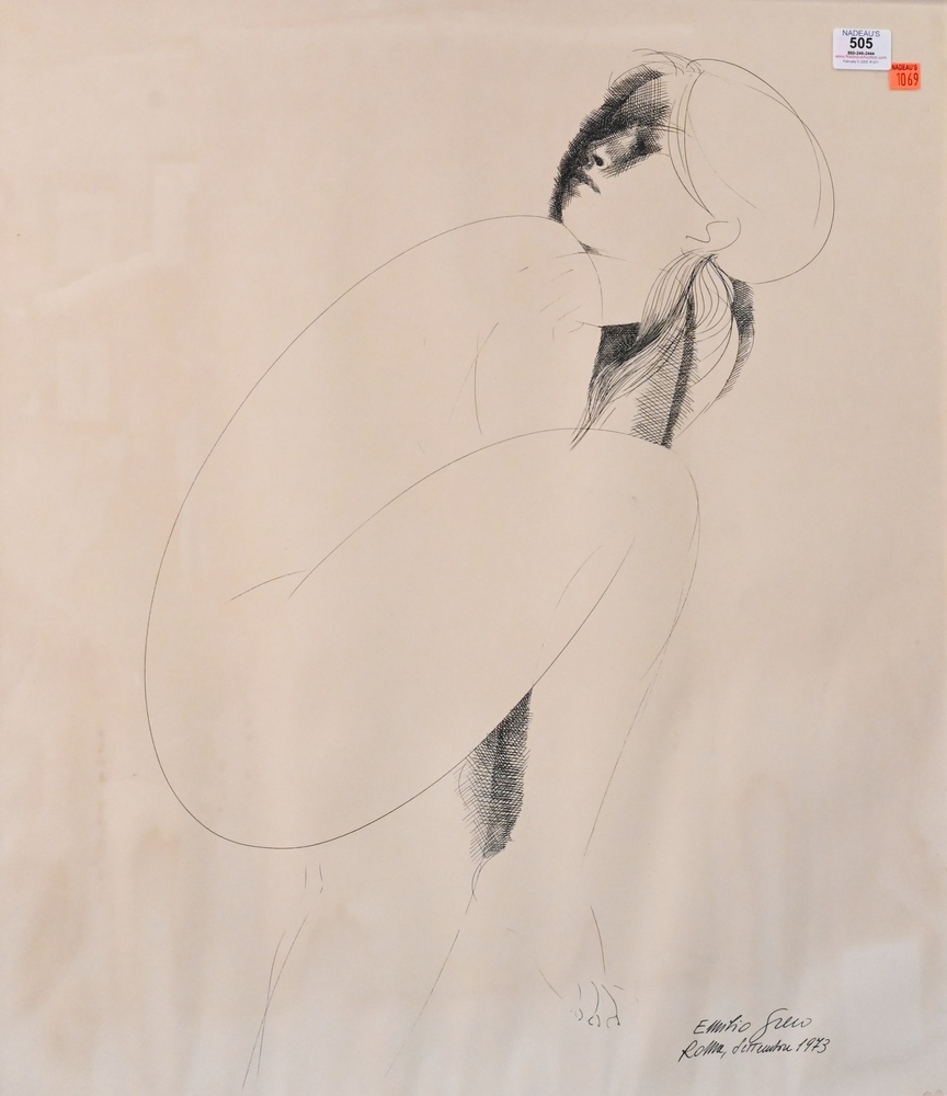 Two piece lot, to include Emilio Greco (1913-1995), Nude Girl, pen and ink on paper, signed lower right Emilio Greco Roma 1973, along with large poster, pen on ink 27.5″ x 23.5″.