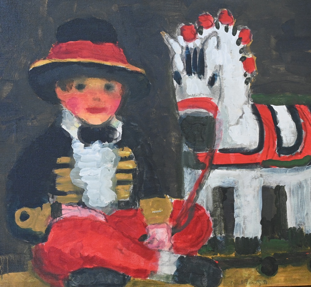David Fertig (b. 1946), Boy with Toy Horses, oil on canvas, signed and dated lower right David Fertig 93′, signed, titled and dated on stretcher Boy with Toy Horse David Fertig 93′, Eastlake Gallery Label on verso, 22″ x 26″ with painted matching frame.