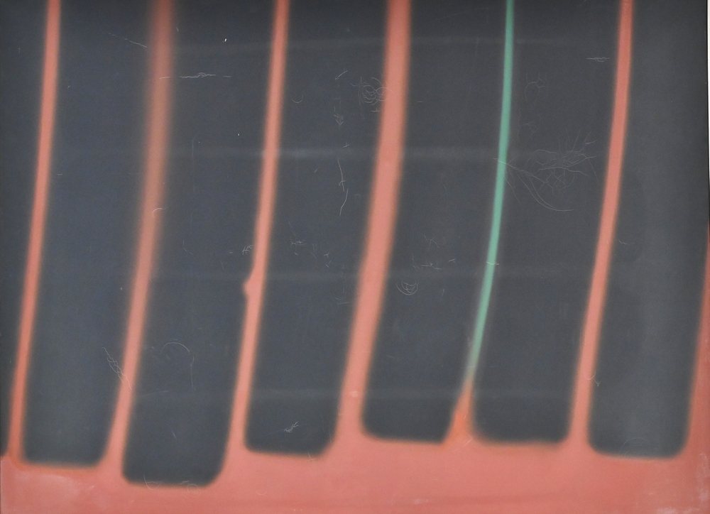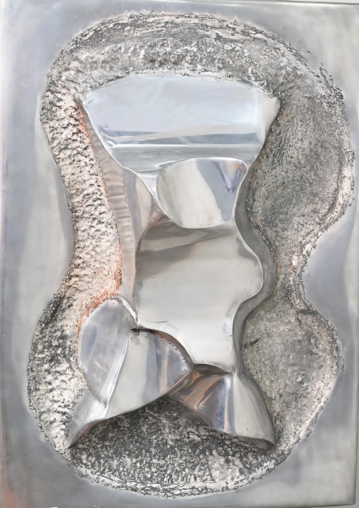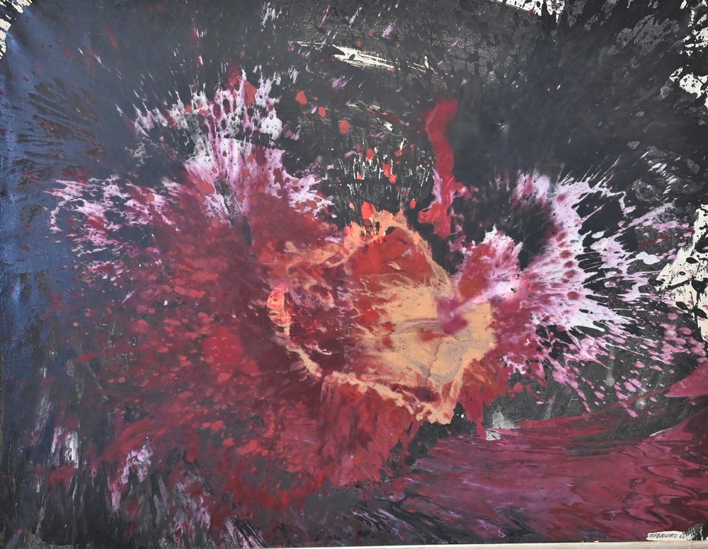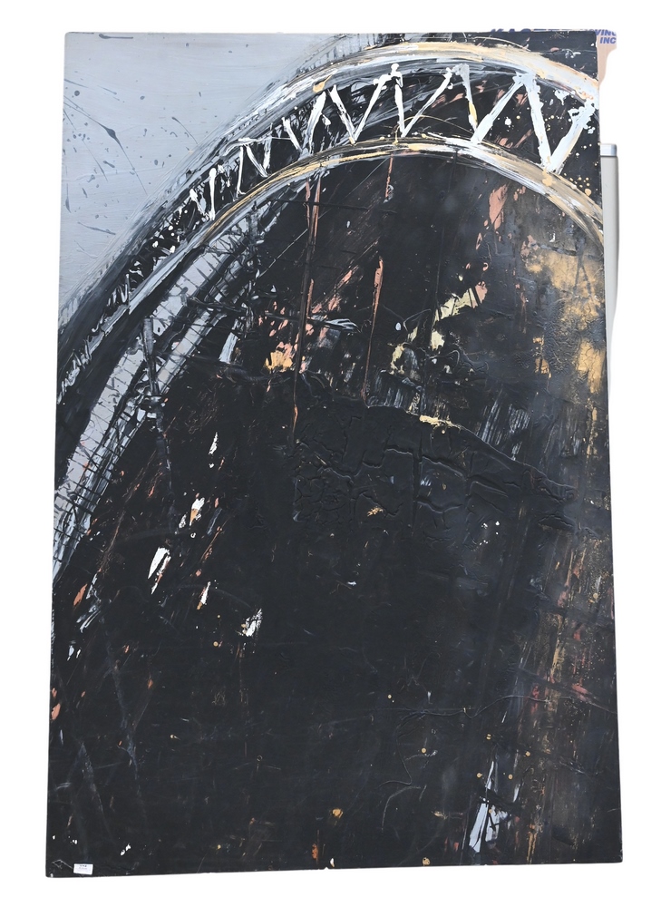 Freya Hansell (American, 1940-2006), Roller, 1986, oil on acrylic and enamel on canvas, signed and dated on verso, Piezoelectric Gallery on verso, 72″ x 48″.