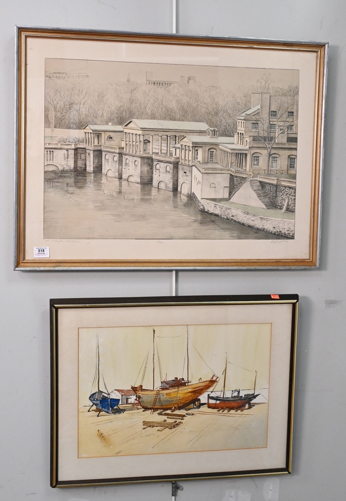 Two Framed Pieces, to include Richard Haas (American, b. 1936), Old Waterworks, Philadelphia, aquatint in colors on paper, signed, titled, and numbered 201/235 in pencil throughout the lower margin, image size 18″ x 25.5″; along with a watercolor, harbour scene, signed illegibly, 13.5″ x 18.5″.