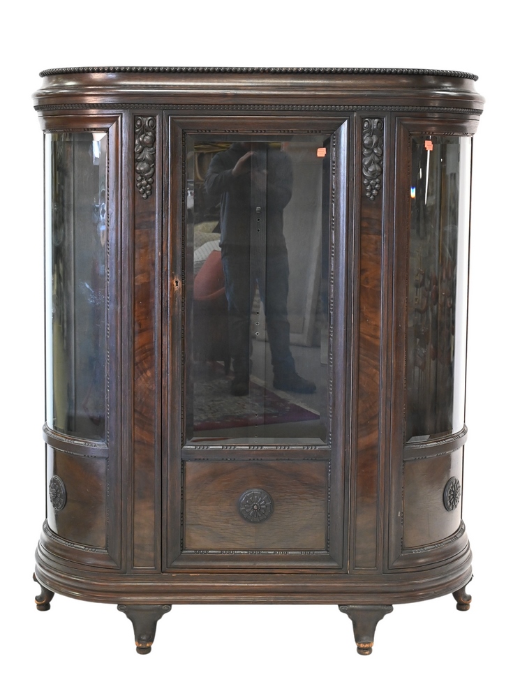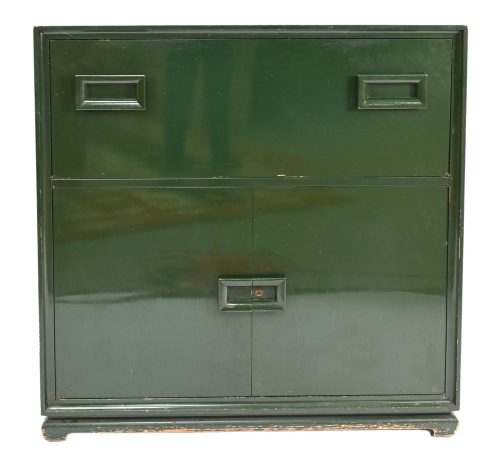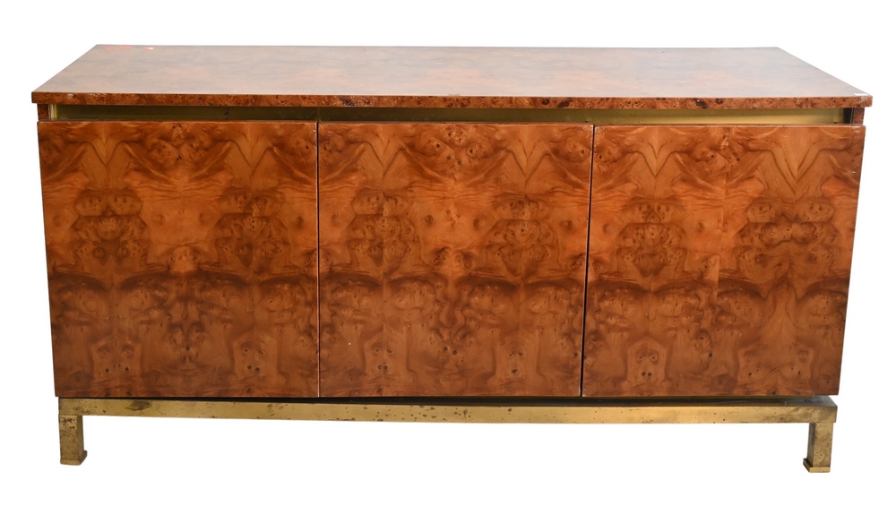 Guy Lefevre for Maison Jansen Sideboard, having burled veneer book matched in a geometric concentric pattern, stamped on verso Encheres Cote d’Opale, height 28 inches, length 57.5 inches, depth 20.75 inches.
