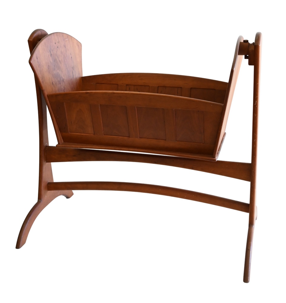 Contemporary Bench Made Cherry Cradle, height 43 inches, length 46 inches; along with a vintage Van Hentley childs toy in the form of a bee, signed on bottom.