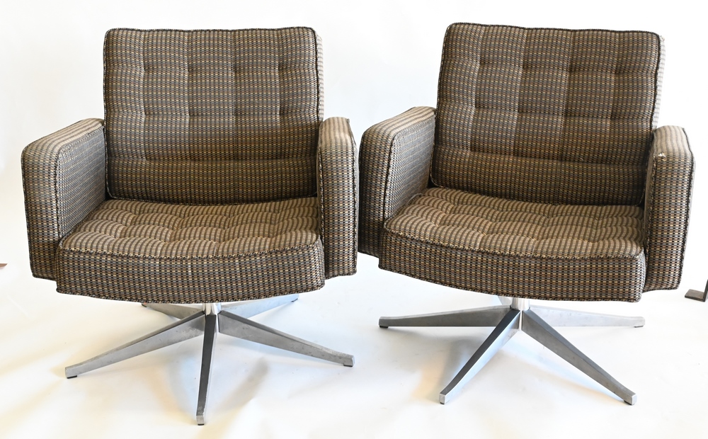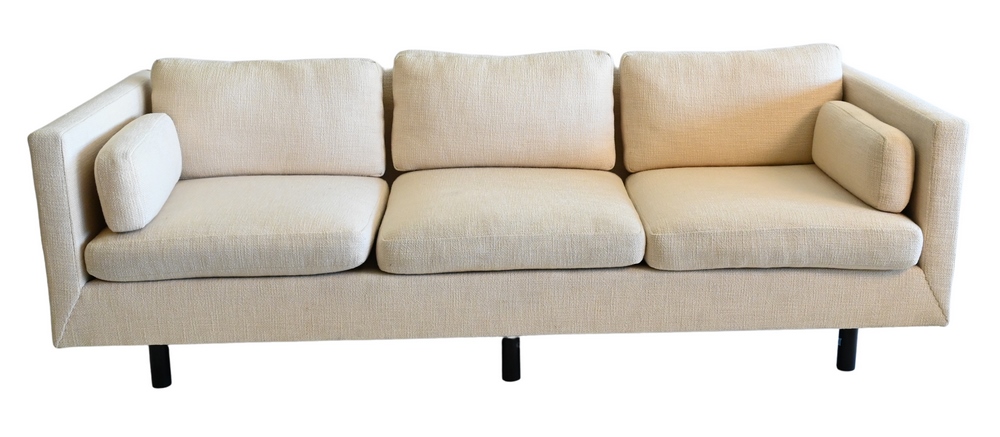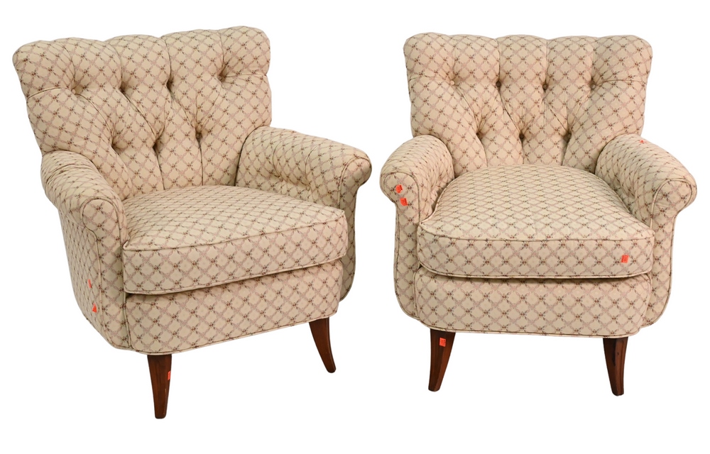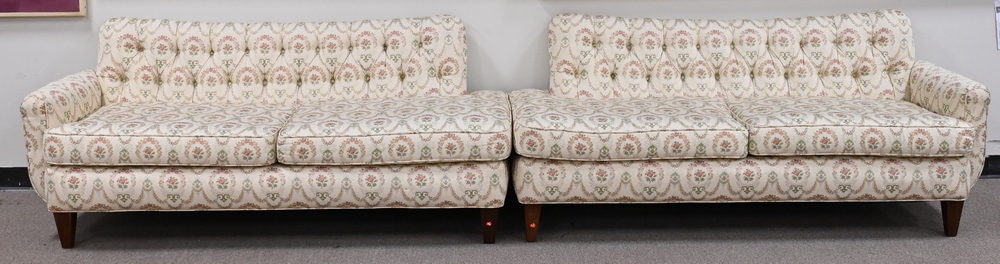 Six Piece Lot, to include two part upholstered sofa, oval bench, and a curule base stool, length of each section 72 inches; along with a pair of Victorian style chairs.