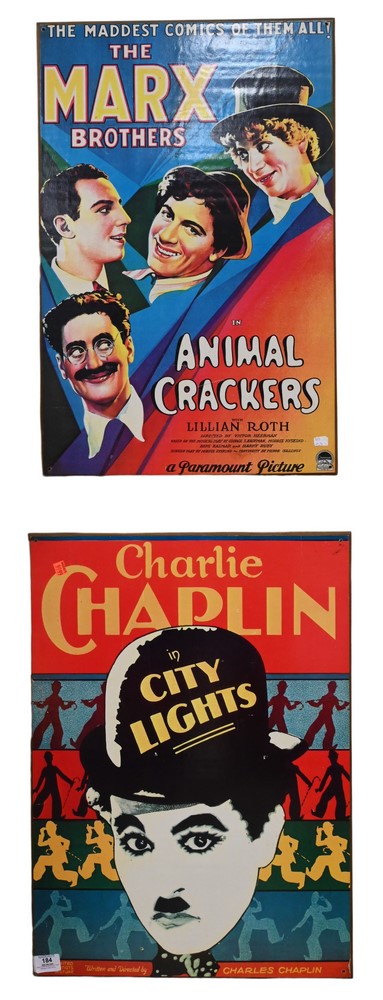 Group of Five Faux Posters Mounted on Board, the Marx Brothers, Animal Crackers; Gone with the Wind, David Selznick; March of the Wooden Soldiers, Laurel and Hardy; My Little Chickadee and Charlie Chaplin in City Lights. 28″ x 18″. Provenance: The Estate of Ed Brenner, Short Hills N.J.