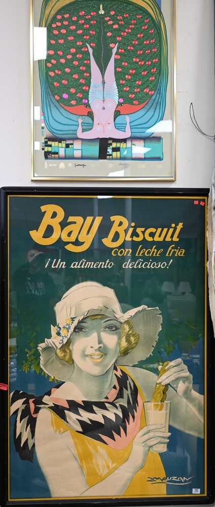 Two Framed Pieces, to include Bay Biscuit Con Leche Fria, poster; Friedensreich Hundertwasser, homage to Schroeder Sonnenstern, screen print with metal imprinting on laid paper, 571/4,200, poster 59″ x 39″.