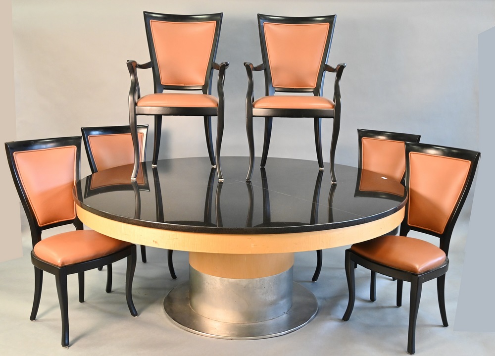 Eight Piece Custom Dining Set, with round granite top table on pedestal, six leather upholstered chairs, and sideboard with granite center, table height 29 inches, table diameter 72 inches, server width 73 inches.