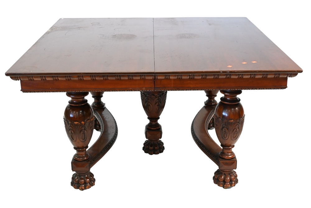 Victorian Mahogany Square Dining Table, having large paw feet and center leg, one leaf, height 30 inches, top 64″ x 64″. Provenance: Estate of James Dana English of New Haven to benefit the New Haven CT Museum.