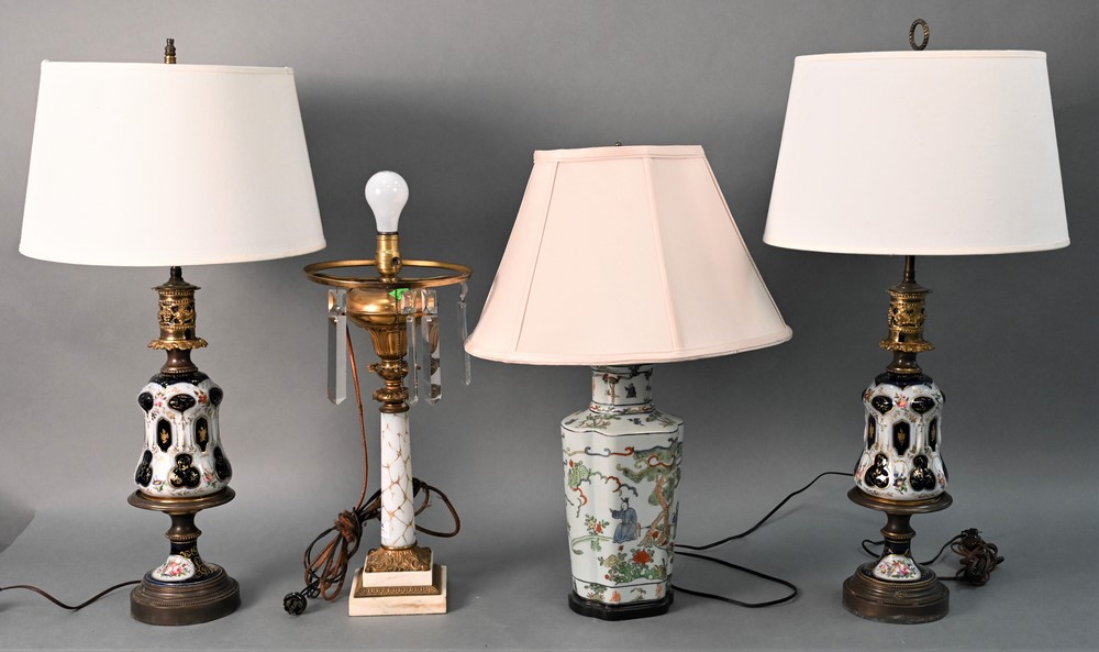 Four Table Lamps, to include a pair of blue and white porcelain oil lamps, Chinese style lamp, and a Victorian oil lamp on marble base, tallest 33 inches.