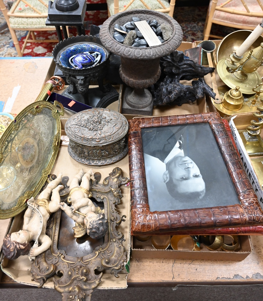 Assorted Brass Grouping, to include pair of Victorian brass figural candelabras, having partially clad figure finial with two arms each electrified, twist candlesticks, desk set, large candlesticks, etc.