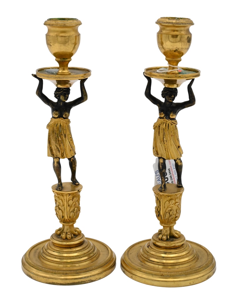 Pair of French Bronze Figural Candlesticks, each having nude female shaft, standing on a pedestal with claw feet on circular base, height 8 1/4 inches.