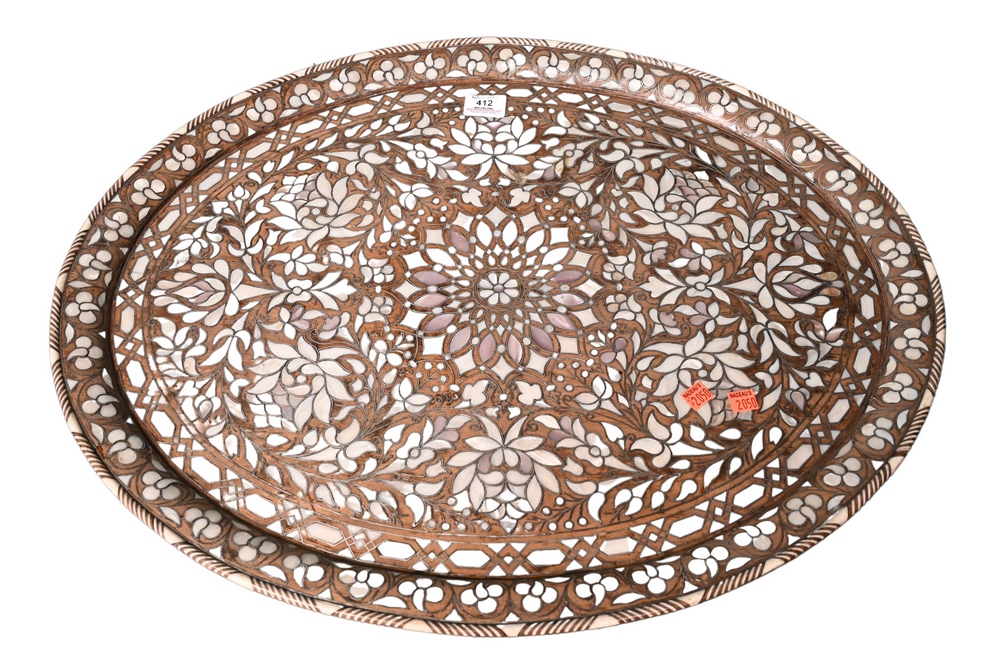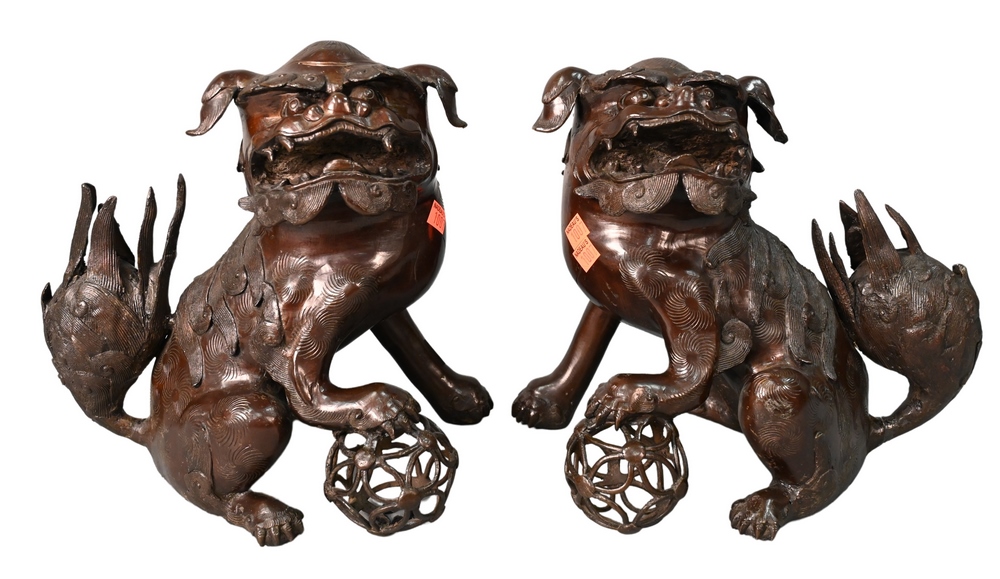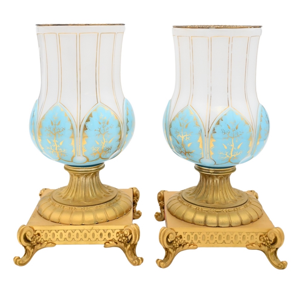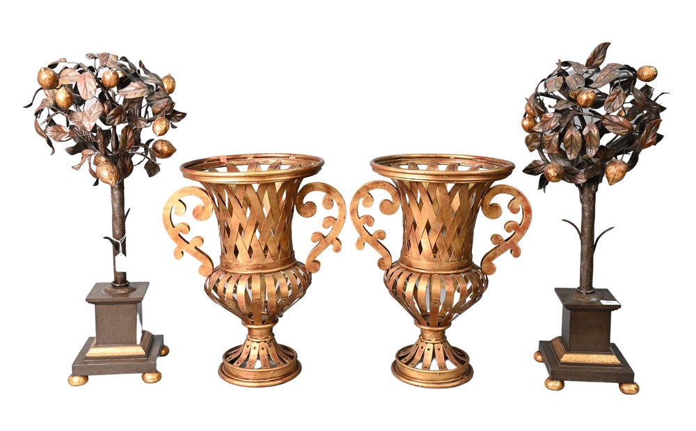Two Pairs of Metal Sculptures, to include pair of painted metal lemon tree sculptures on wooden bases, height 30 inches; and a pair of contemporary gold painted metal basket weave urns with handles, height 20 inches.