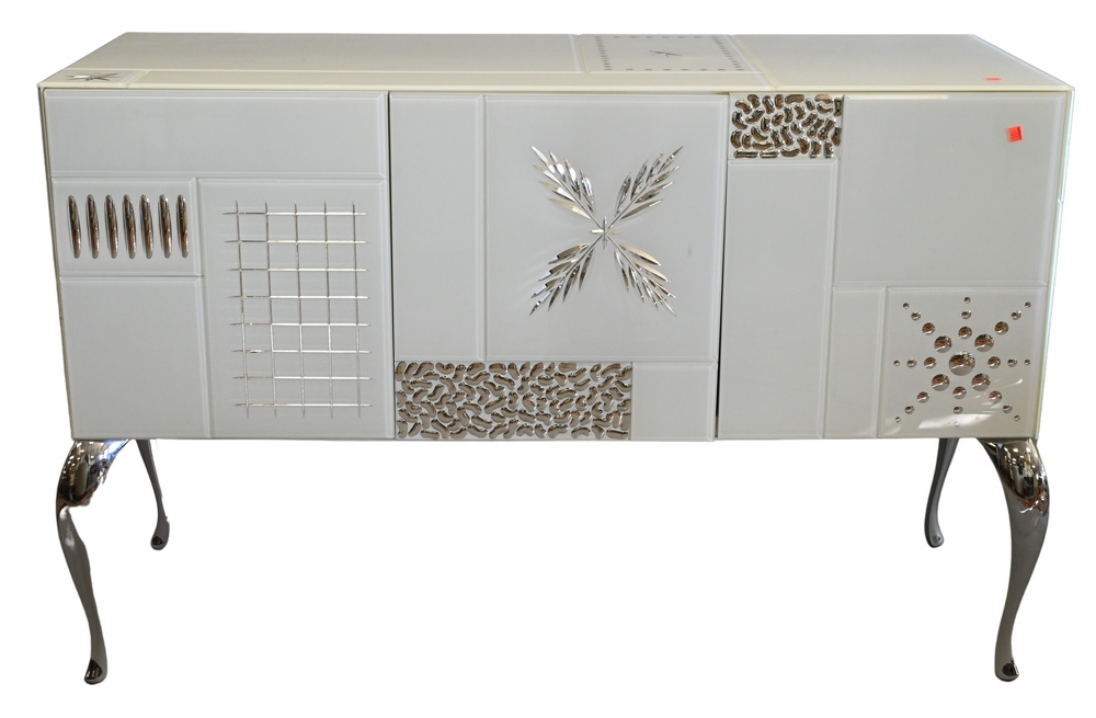 Arte Veneziana Purity Contemporary Buffet, artistic geometric mirrored Murano glass engravings on white glass, opening to fitted drawer interior all raised on chrome legs, by Leo De Carlo, height 36 inches, top 20″ x 55″.