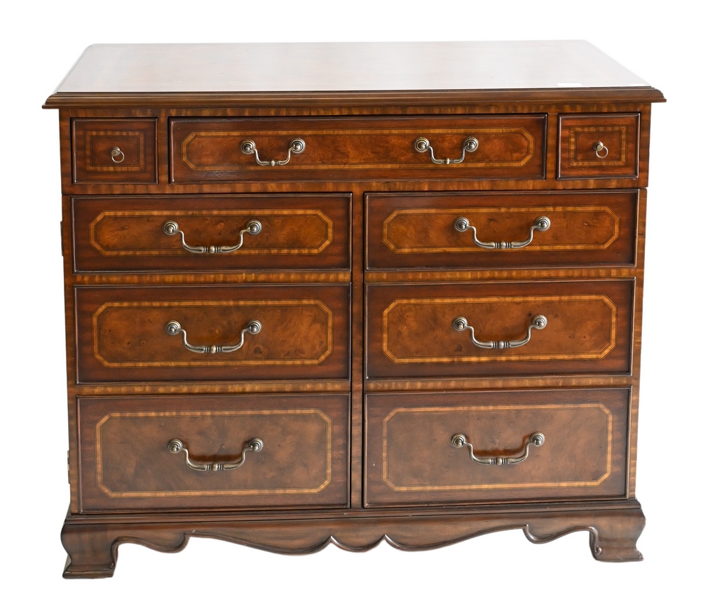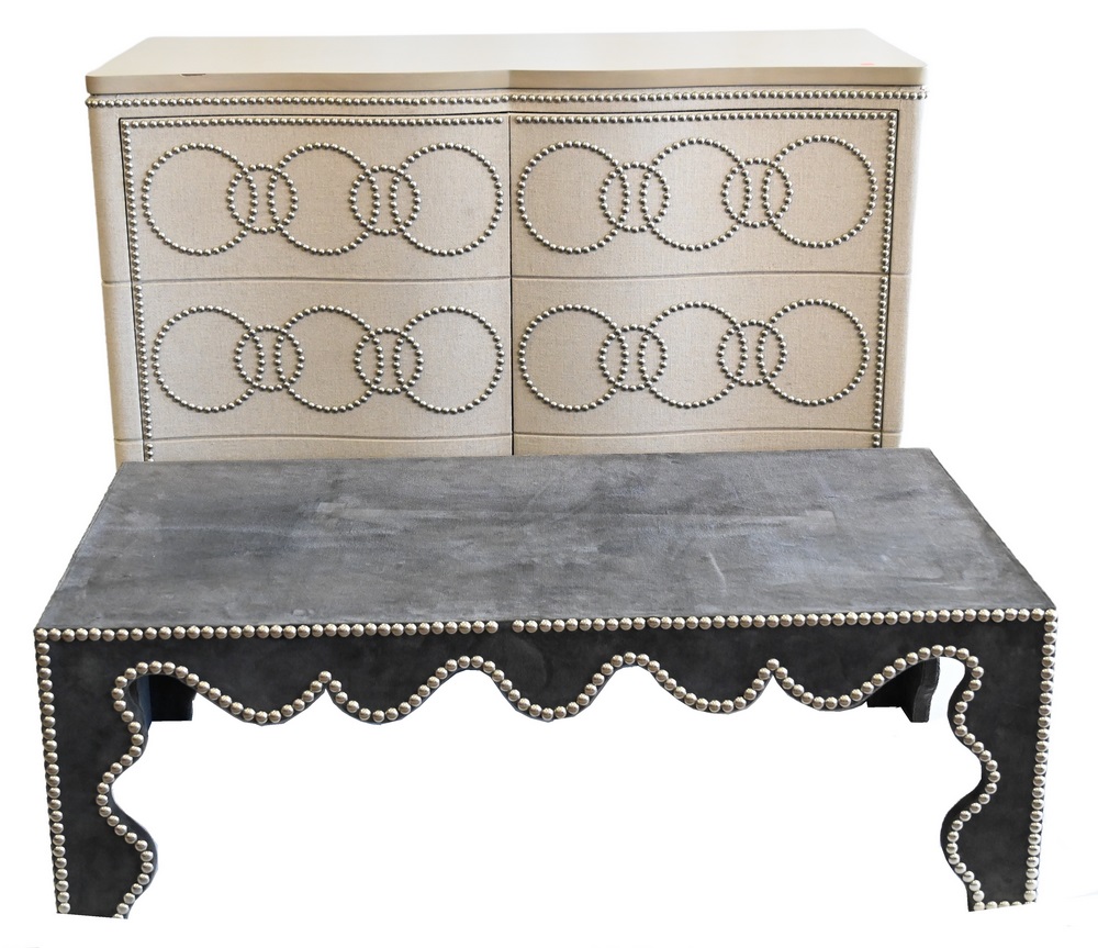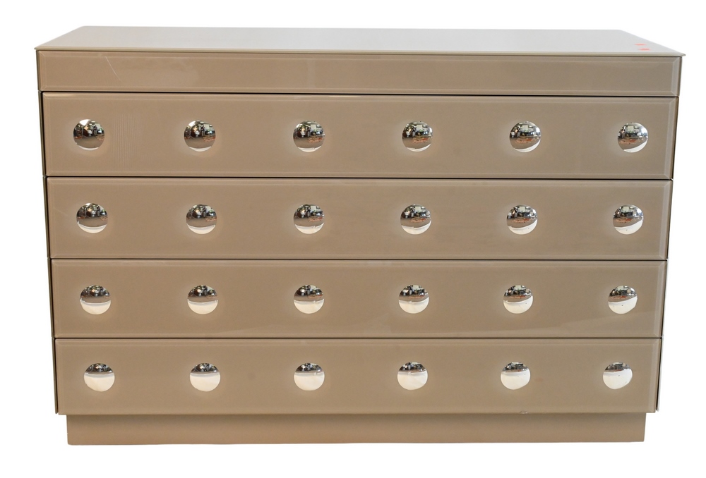 Arte Veneziana CDA Modern Chest of Drawers, handmade luxury tan and mirrored with green lacquered inner finish, having Bulle Fiamminga decor, height 31.75 inches, top 18.25″ x 47″.