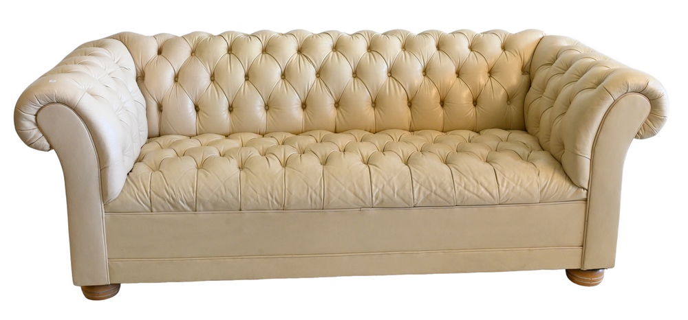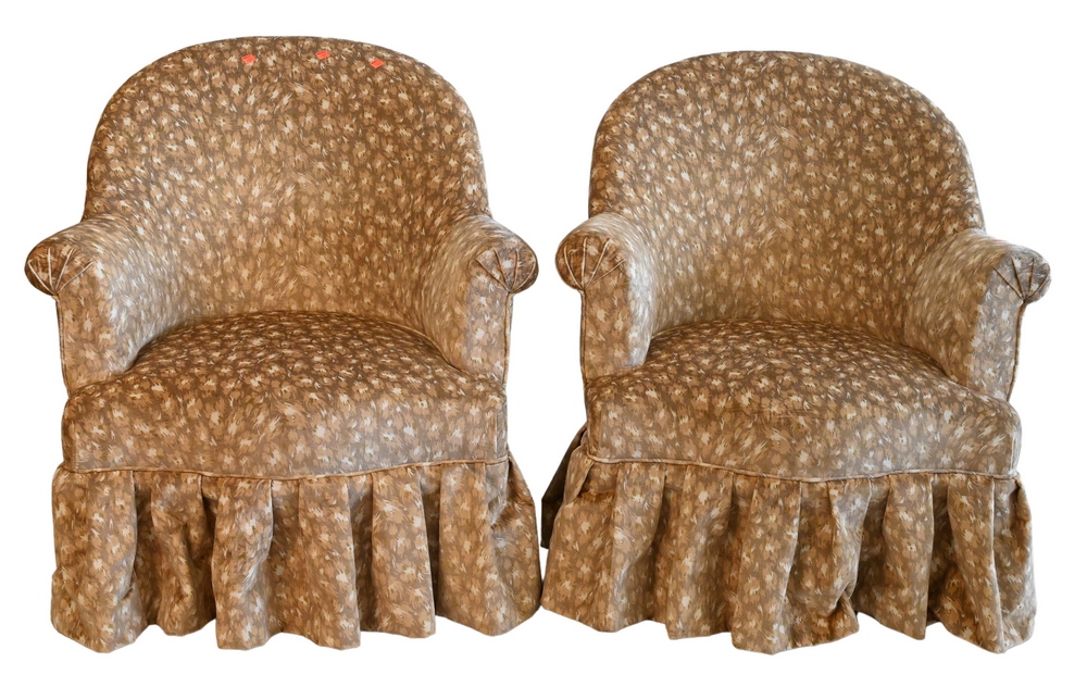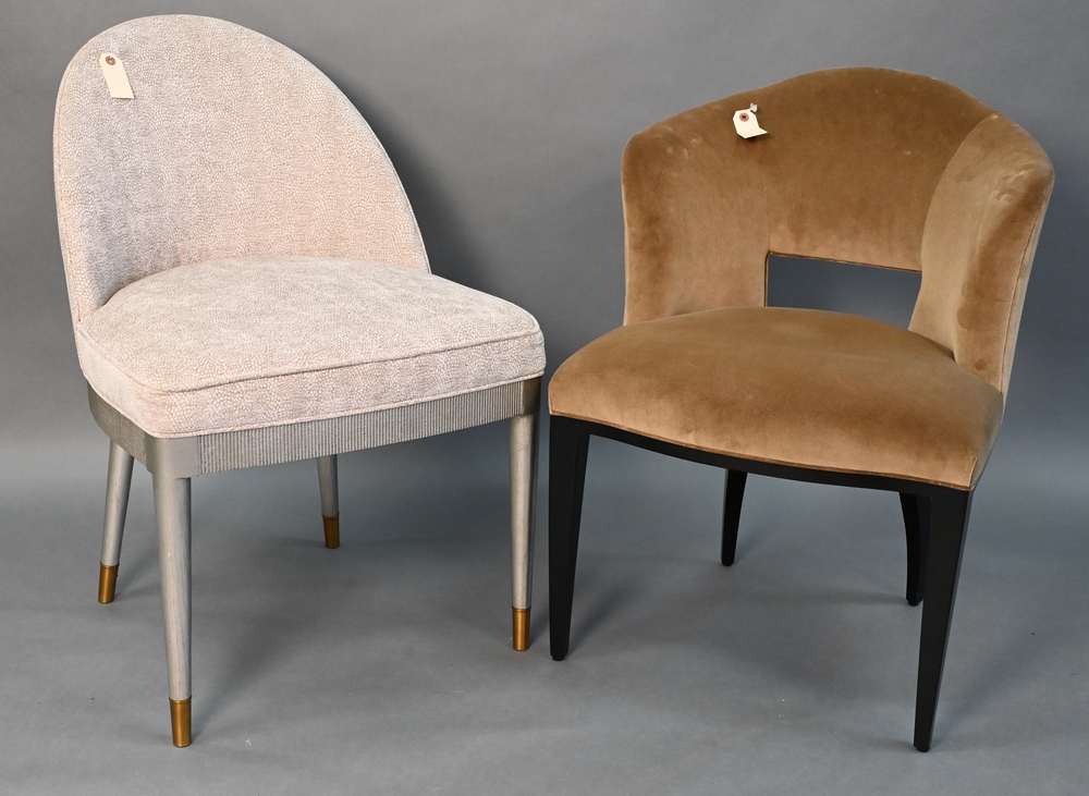 Two Piece Lot, to include Henredon Laurent dining side chair in gray upholstery on silvered turned legs, along with Donghia tan upholstered side chair, Henredon seat height 19 inches, height to top of backs 32 3/4 inches, Donghia seat height 18 inches, height to top of back 31 inches.