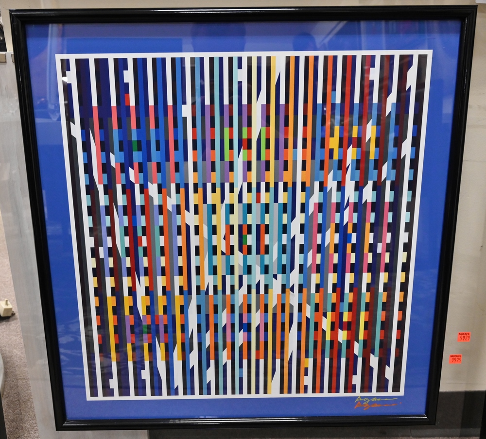 Yaacov Agam (Israel, b. 1928), Chaim, from the four piece Ner-Tamid Suite, 1990, serigraph in colors with black passe-partout, signed and numbered 21/36 in silver ink in the lower margin, Published by Park West Galleries, image size 25″ x 31.5″.