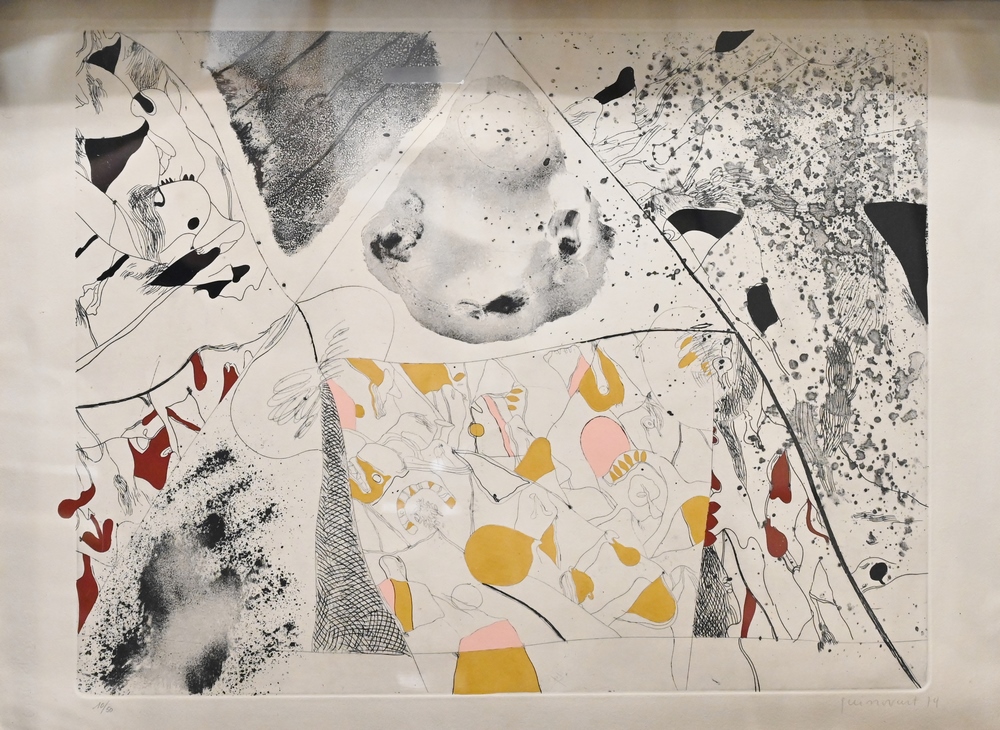 Josep Guinovart Y Bertran (Spanish, 1927-2007), Untitled abstraction, gouache and etching on paper, signed, dated and numbered in pencil through the lower margin 10/50 Guinovart 74′, River Gallery Letter on verso, image size 18.5″ x 24.5″.