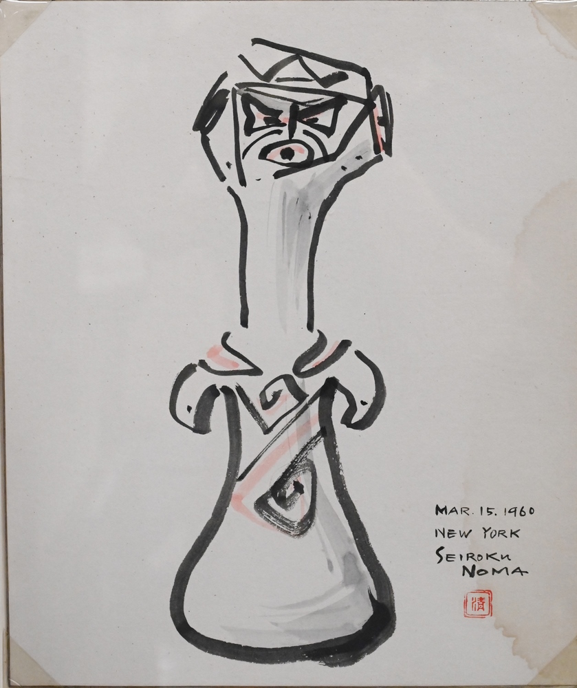 Seiroku Noma (Japanese, 1902-1966), Haniwa (Single Figure), ink and watercolor on paper, signed and dated and inscribed with the artists chop mark lower right “Seiroku Noma Mar 15, 1960, New York Seiroku Noma”, 14.25″ x 11.75″ sheet size.