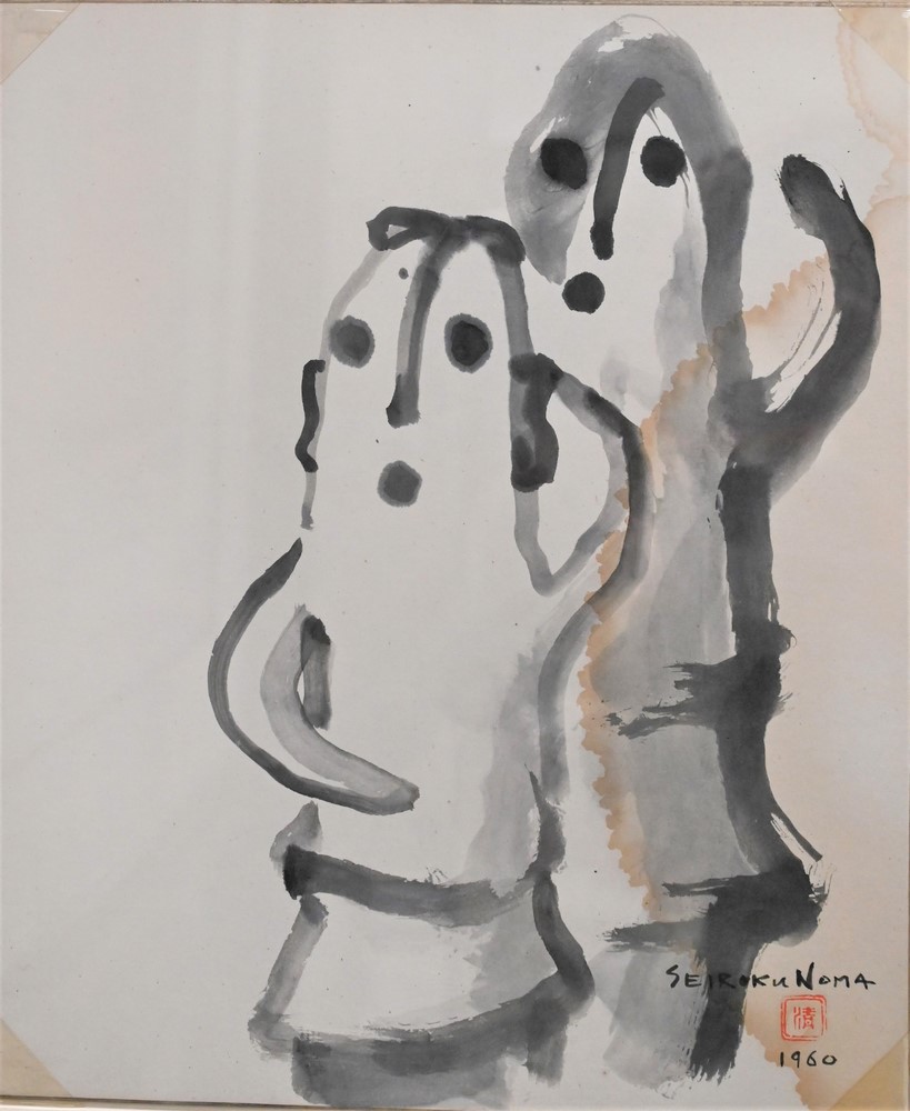 Seiroku Noma (Japanese, 1902-1966), Haniwa (Double Figure), ink and watercolor on paper, signed and dated and inscribed with the artists chop mark lower right “Seiroku Noma 1960″, 14.25″ x 11.25” sheet size.