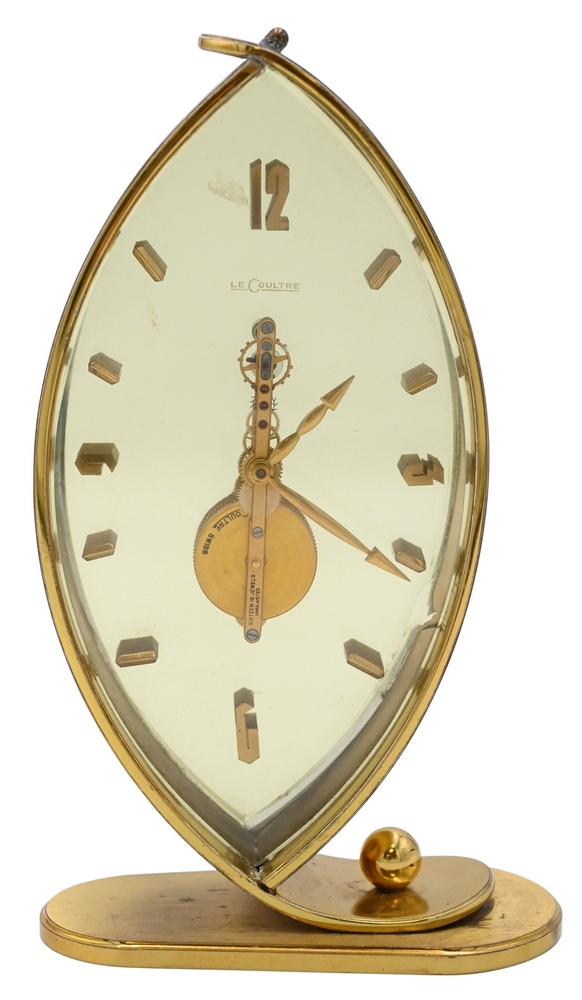 Rare Jaeger – LeCoultre Clock, straight line movement, face marked Le Coultre Swiss, sixteen jewels, and Le Coultre 360 on bottom, height 8 1/4 inches.