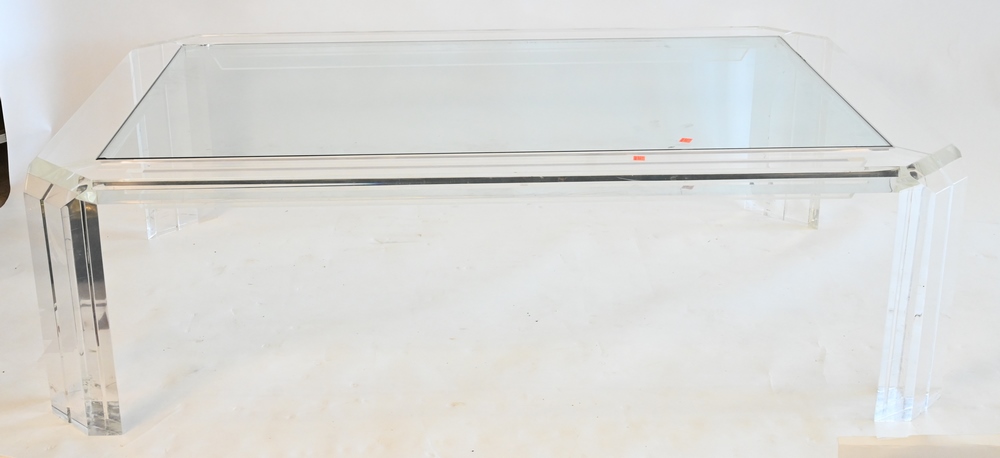 Lucite Glass Coffee Table, rectangle having inset glass with lucite base possibly Karl Springer, chipped glass, height 16 inches, top 36″ x 54″. Provenance: From a private New York City collection.