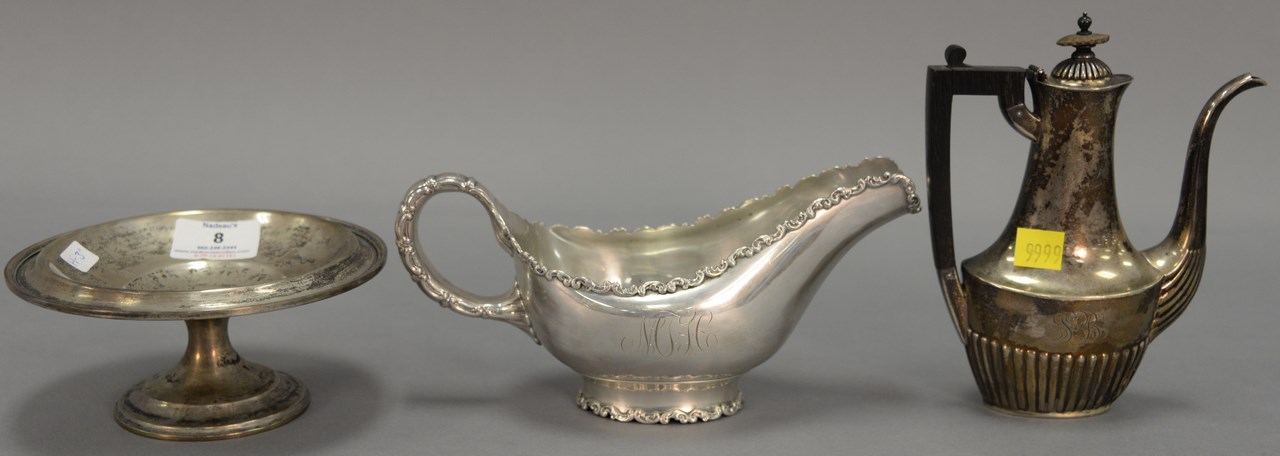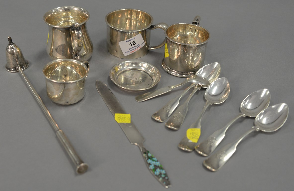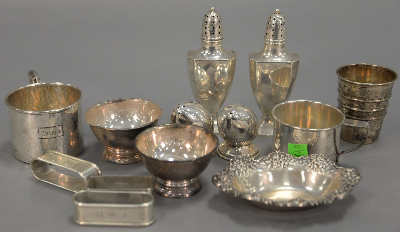 Five pieces of sterling silver to include three porringers, handled mug, and Volupte sterling cigarette holder, ht. 3 1/2 in. 21.7 t oz. weighable silver