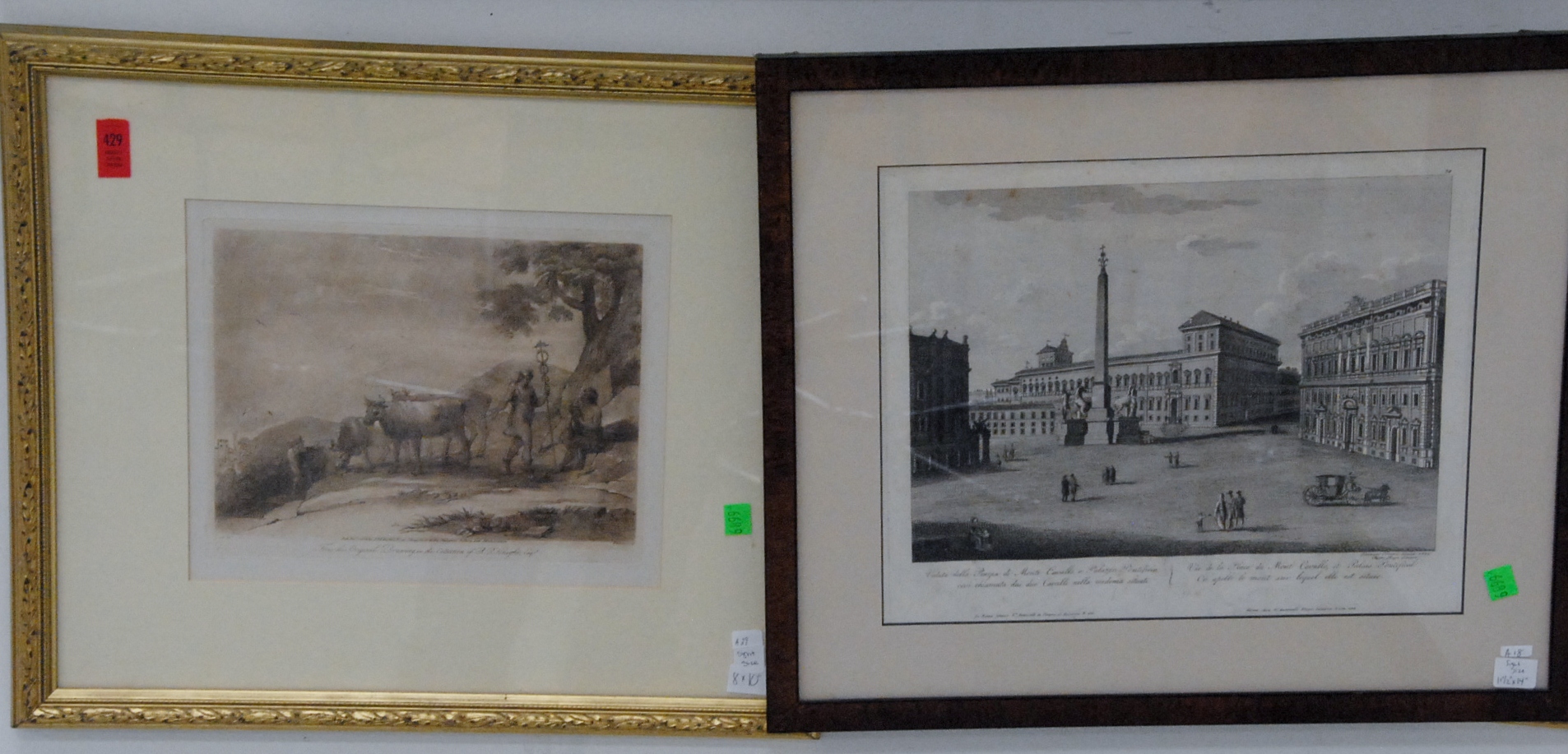 Three framed pieces 2 English sepia allegorical scenes John Boydell/Richard Earlem circa 1780, and an engraving from Architectural Views Of Rome by Parboni/ Giacomo Antonelli 1824.