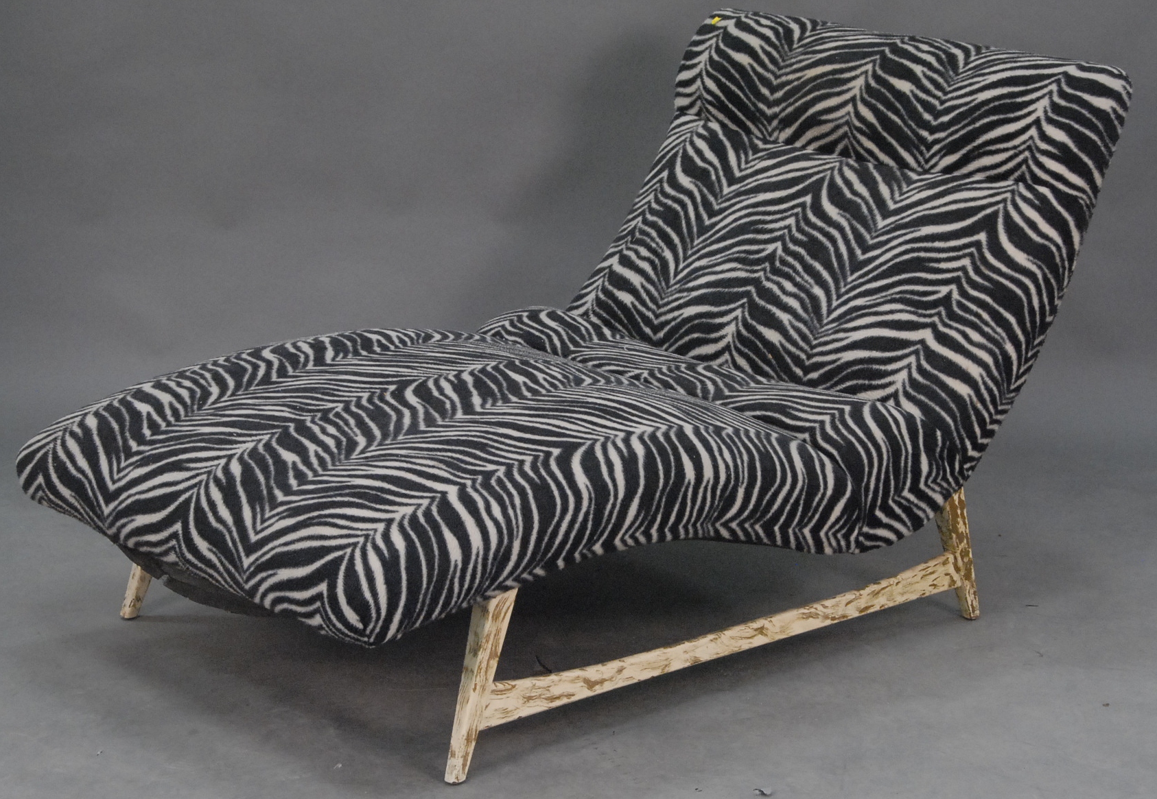 Chaise lounge with faux leopard upholstery on a walnut base with an antiqued finish. Possibly by Norman Fox MacGregor for Valley Upholstery Co. circa 1955.