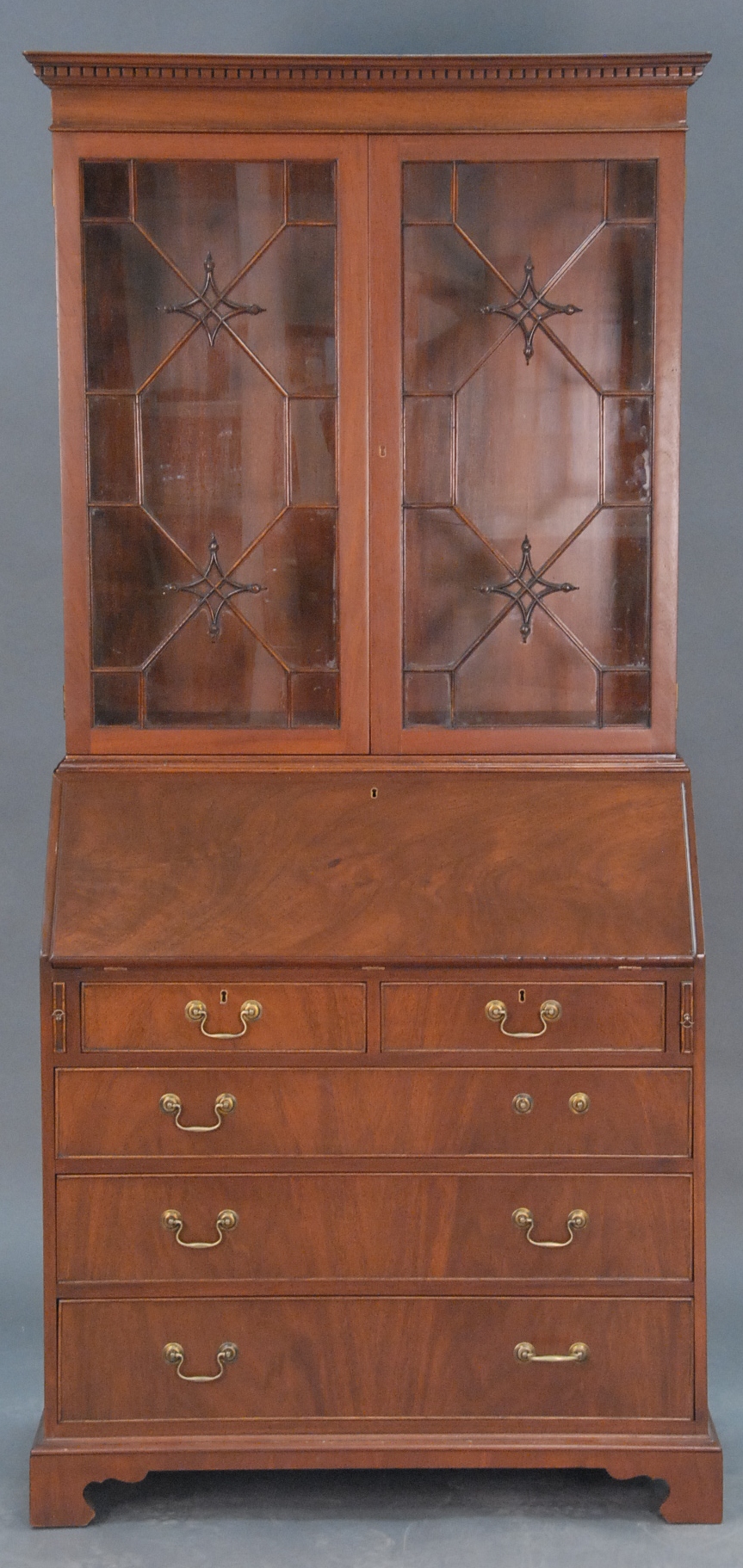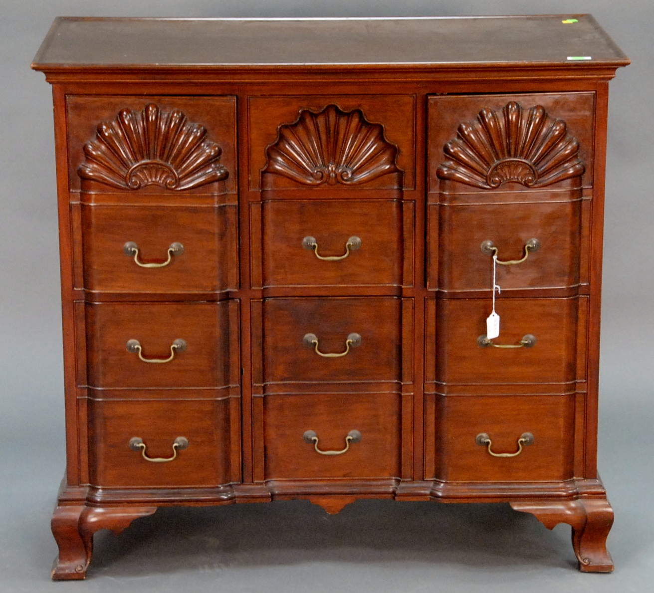 Margolis custom mahogany chest having dished rectangular top, front with triple shell carving and four short center drawers flanked by two doors which are false drawers set on ogee feet with back center board opening to inside, signed Margolis with brand mark Harold Margolis. ht. 35in. wd. 38in. dp. 19in.