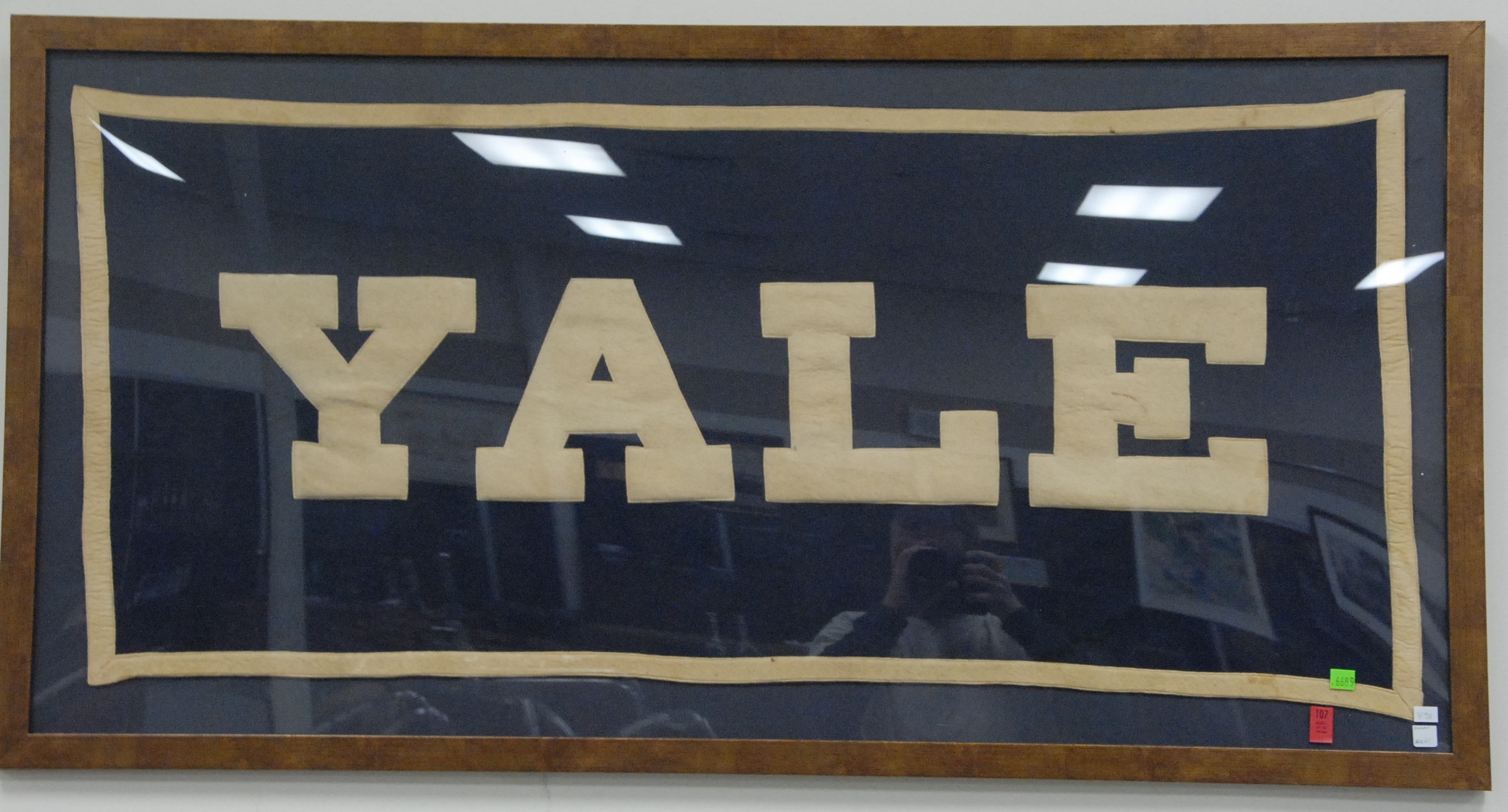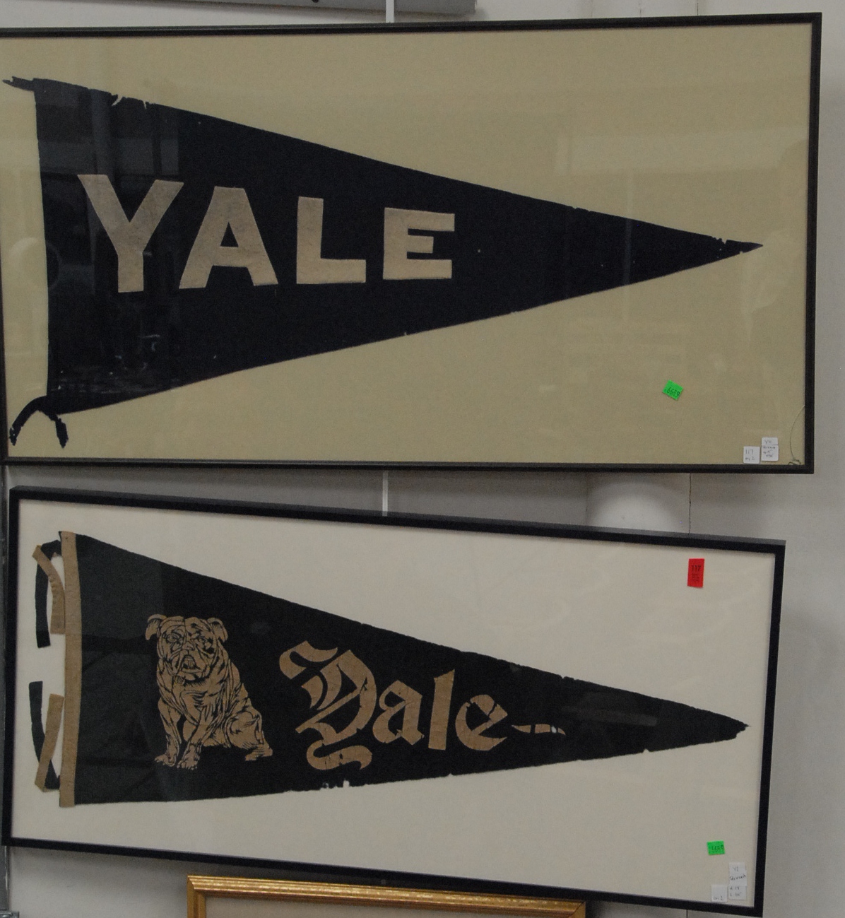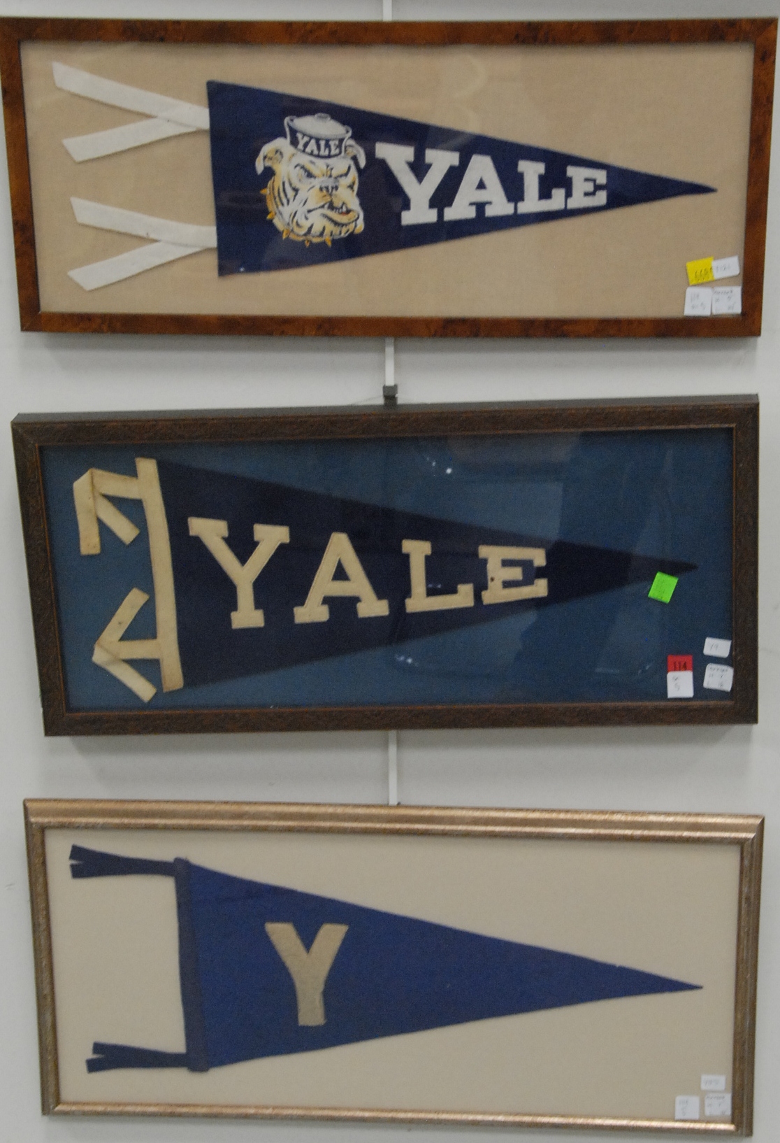 Five piece framed lot Yale pennant circa 1940-1950, Yale circa 1905-1910, Yale pennant 1915-1920, Yale pennant with bulldog circa 1940-1950’s, and Yale pennant circa 1920-1930, 5 x 14, 7 x 16, 7 x 16, 7 1/2 x 15 & 9 x 19.