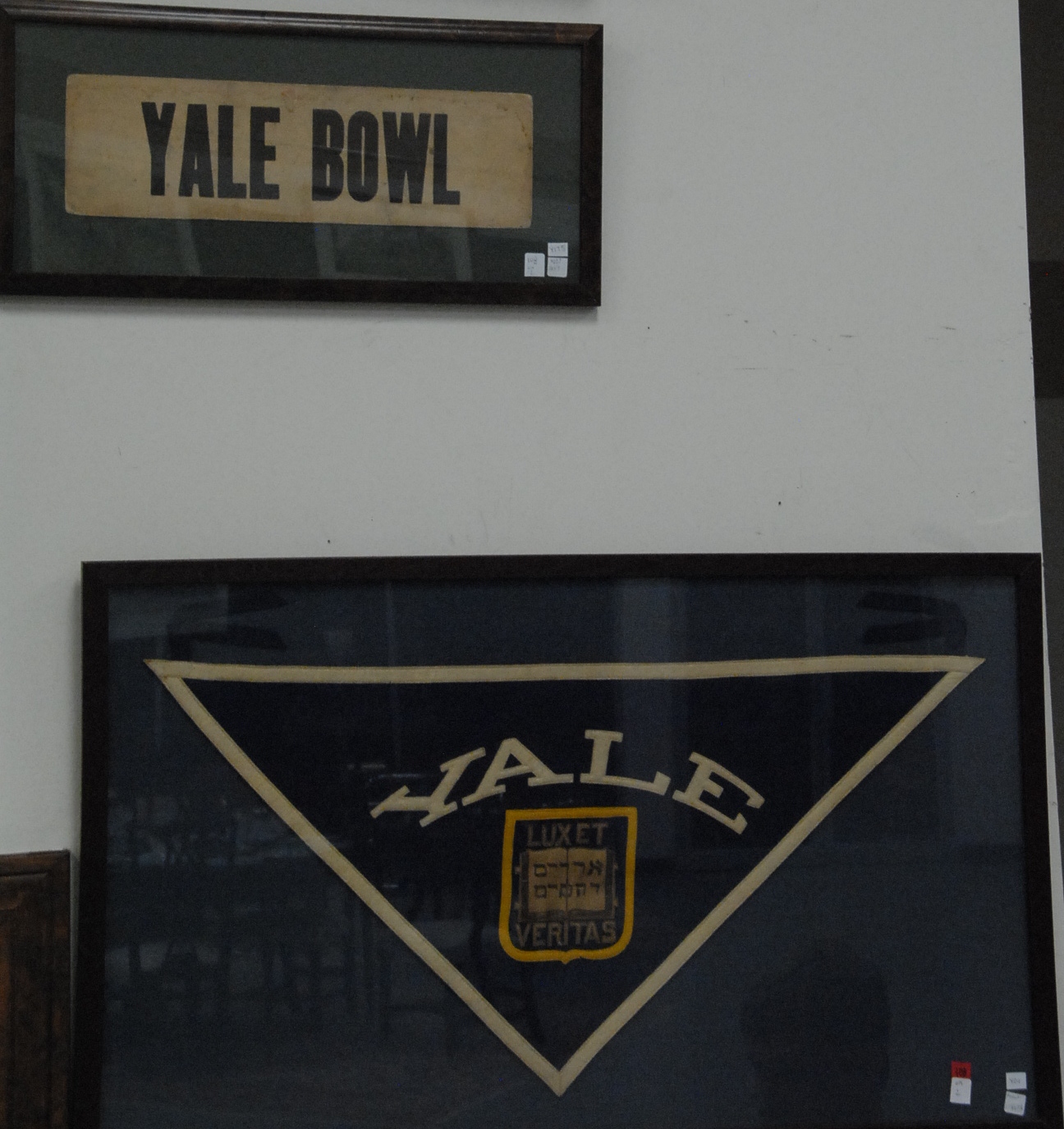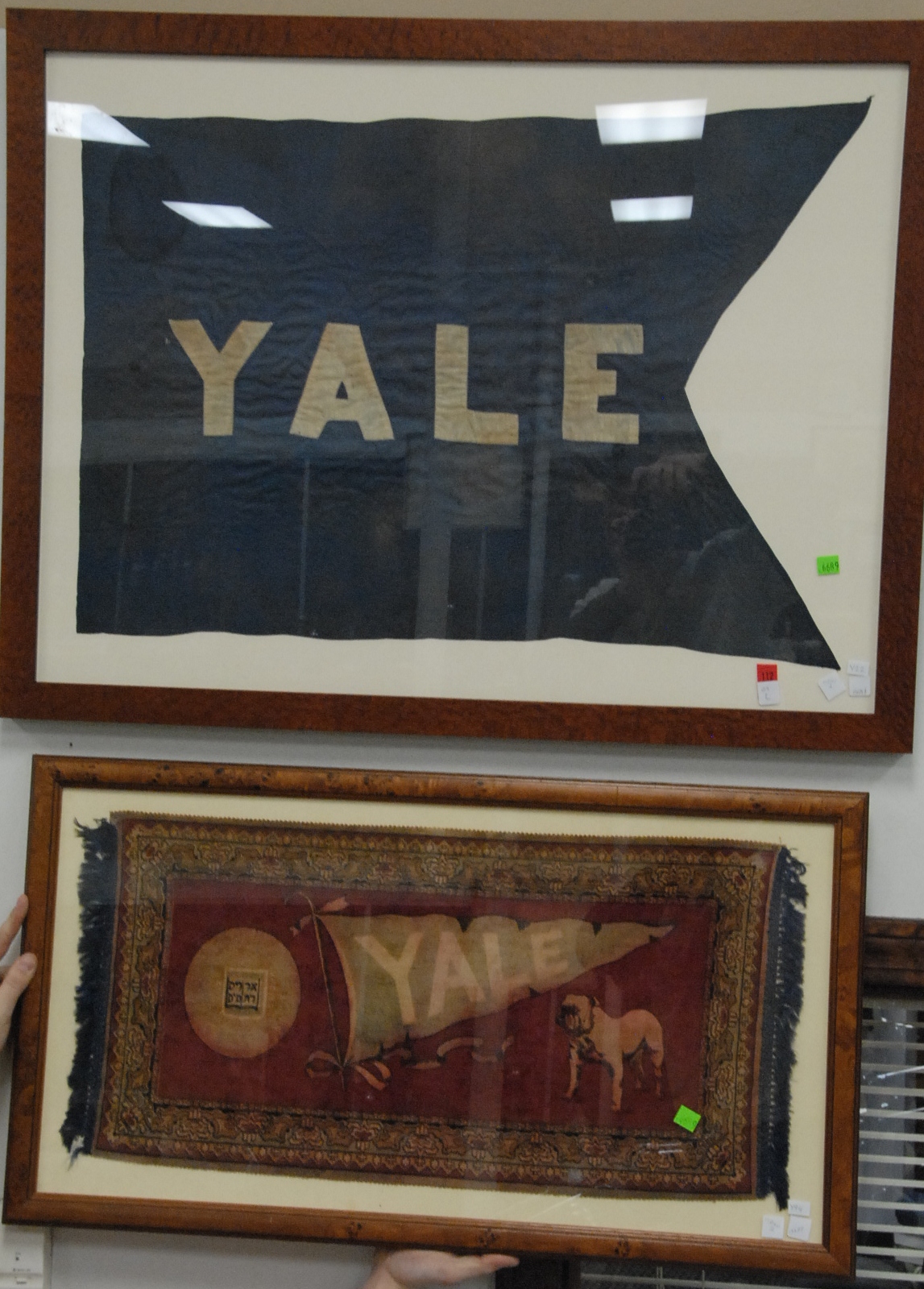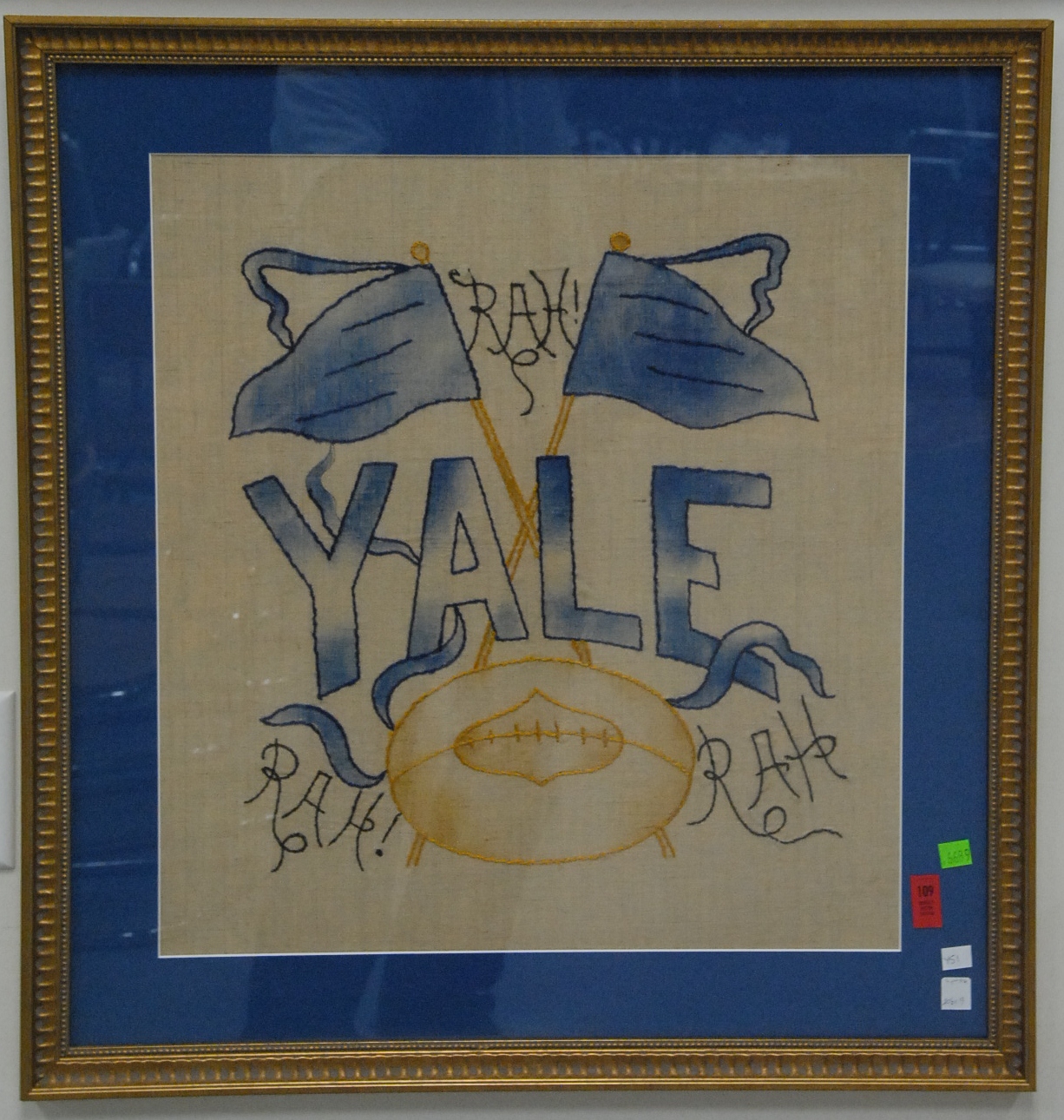 Five piece framed lot Yale pennant circa 1940-1950, Yale circa 1905-1910, Yale pennant 1915-1920, Yale pennant with bulldog circa 1940-1950’s, and Yale pennant circa 1920-1930, 5 x 14, 7 x 16, 7 x 16, 7 1/2 x 15 & 9 x 19.