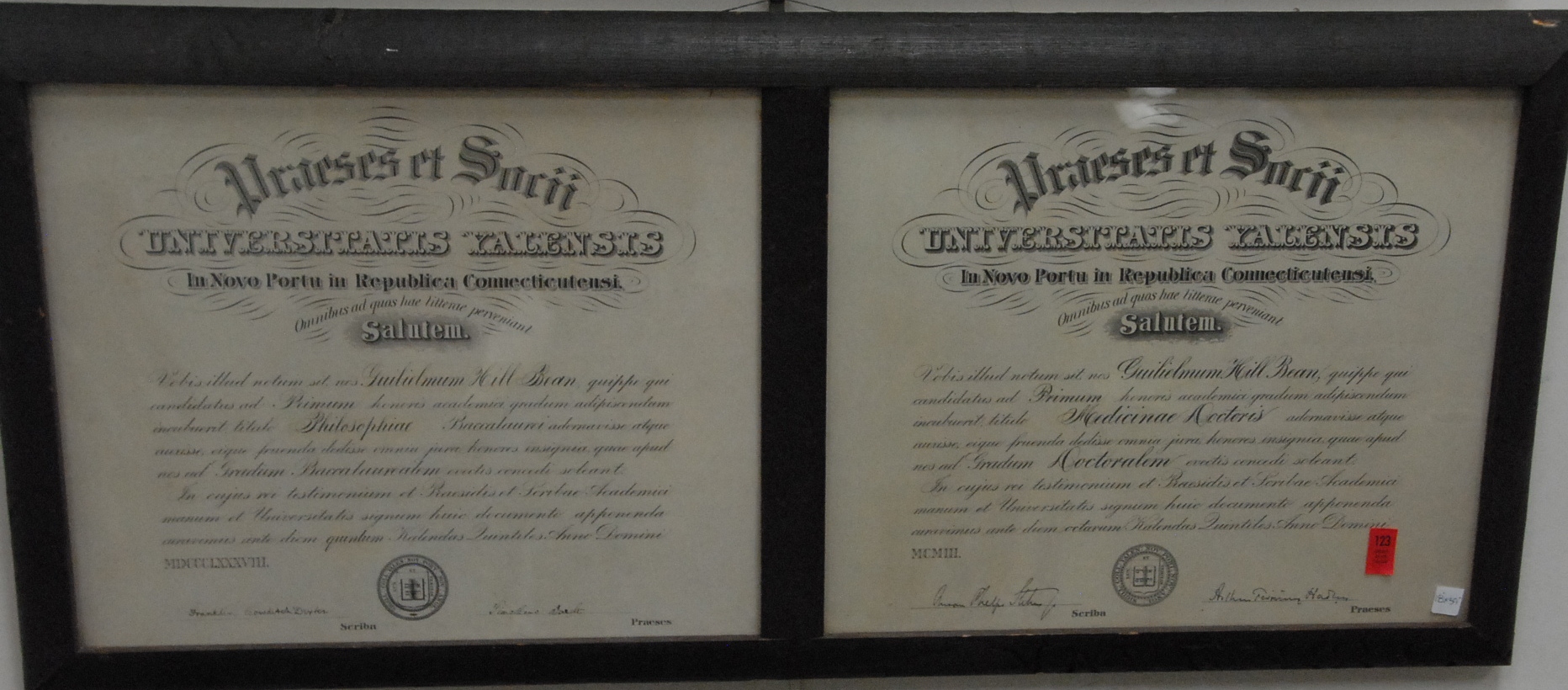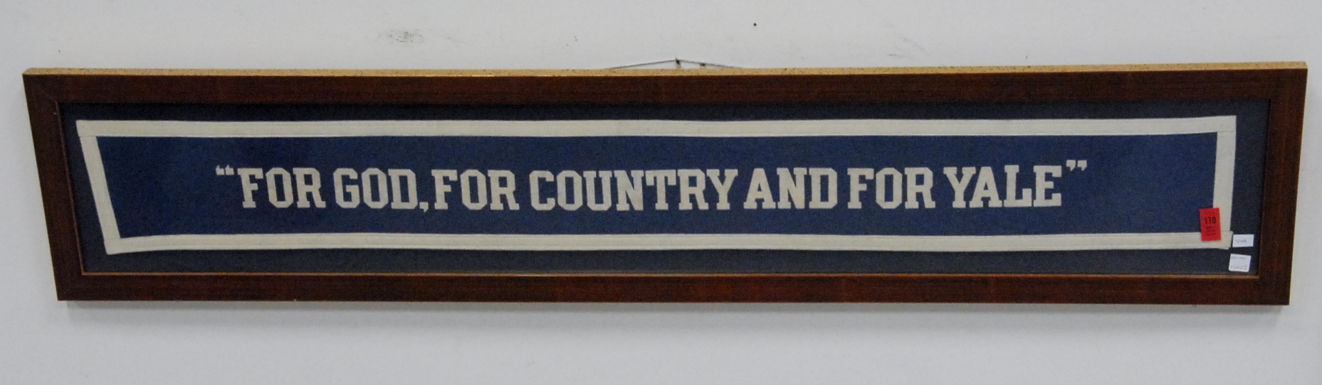 Two piece lot Yale guidon in blue silk with sewn white lettering circa1895-1899, framed and Yale large tobacco pennant 28 Murad 1910-1915, framed, 19 x 28 & 13 x 27.