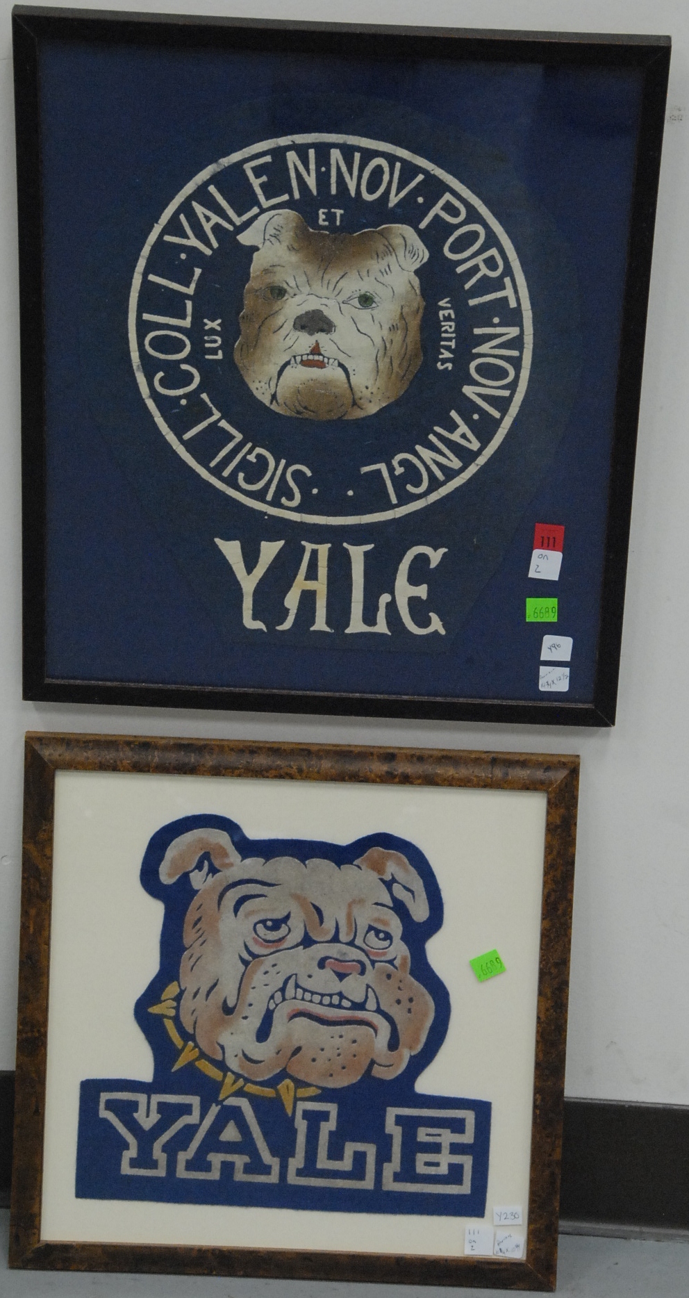 Two piece lot Yale felt seal with fragment of bulldog felt banner 1920’s framed and Yale Bulldog felt large jacket patch 1950’s framed, 10 x 10 & 15 x 12 1/2.