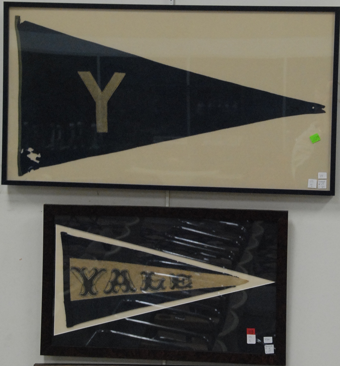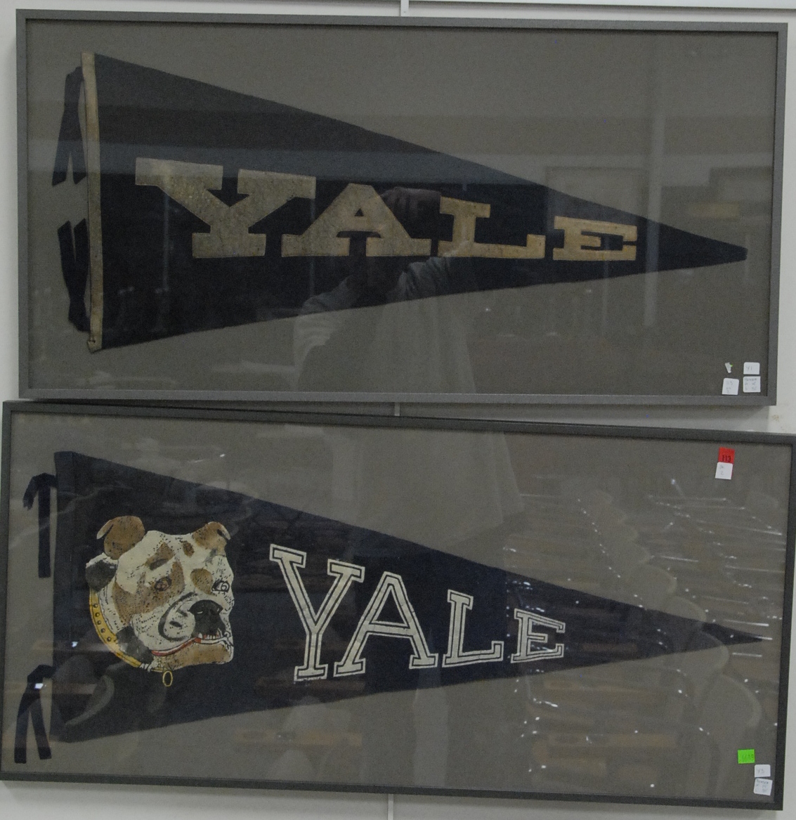 Two piece lot Yale felt pennant sewn letters circa 1910-1915 framed and Yale felt pennant three color graphic bulldog with early lettering circa 1920’s framed, 14 x 31 & 14 x 34.