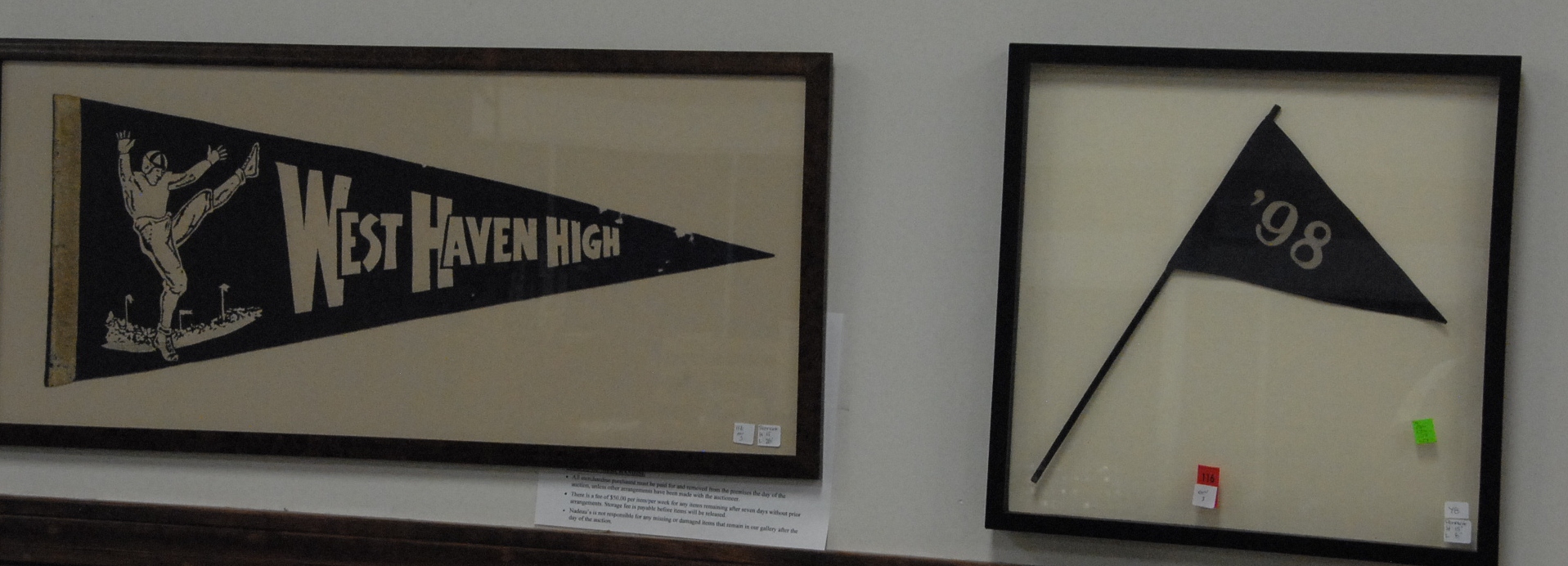 Three piece framed lot class of ’98 mini pennant on wooden stick, New Haven felt pennant sewn letters circa 1910-1920, and West Haven High pennant, 11 x 28, 15 x 8 & 11 x 28