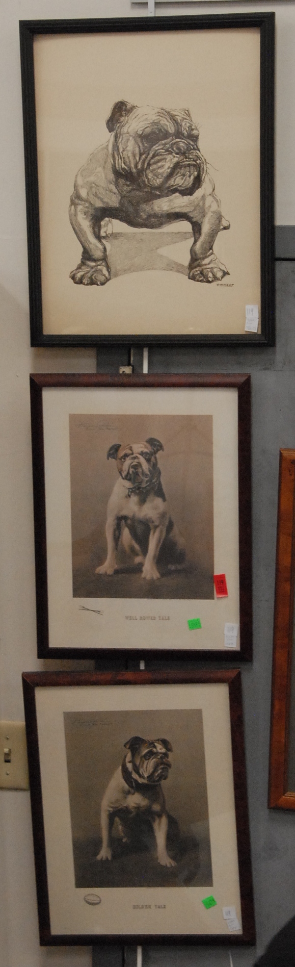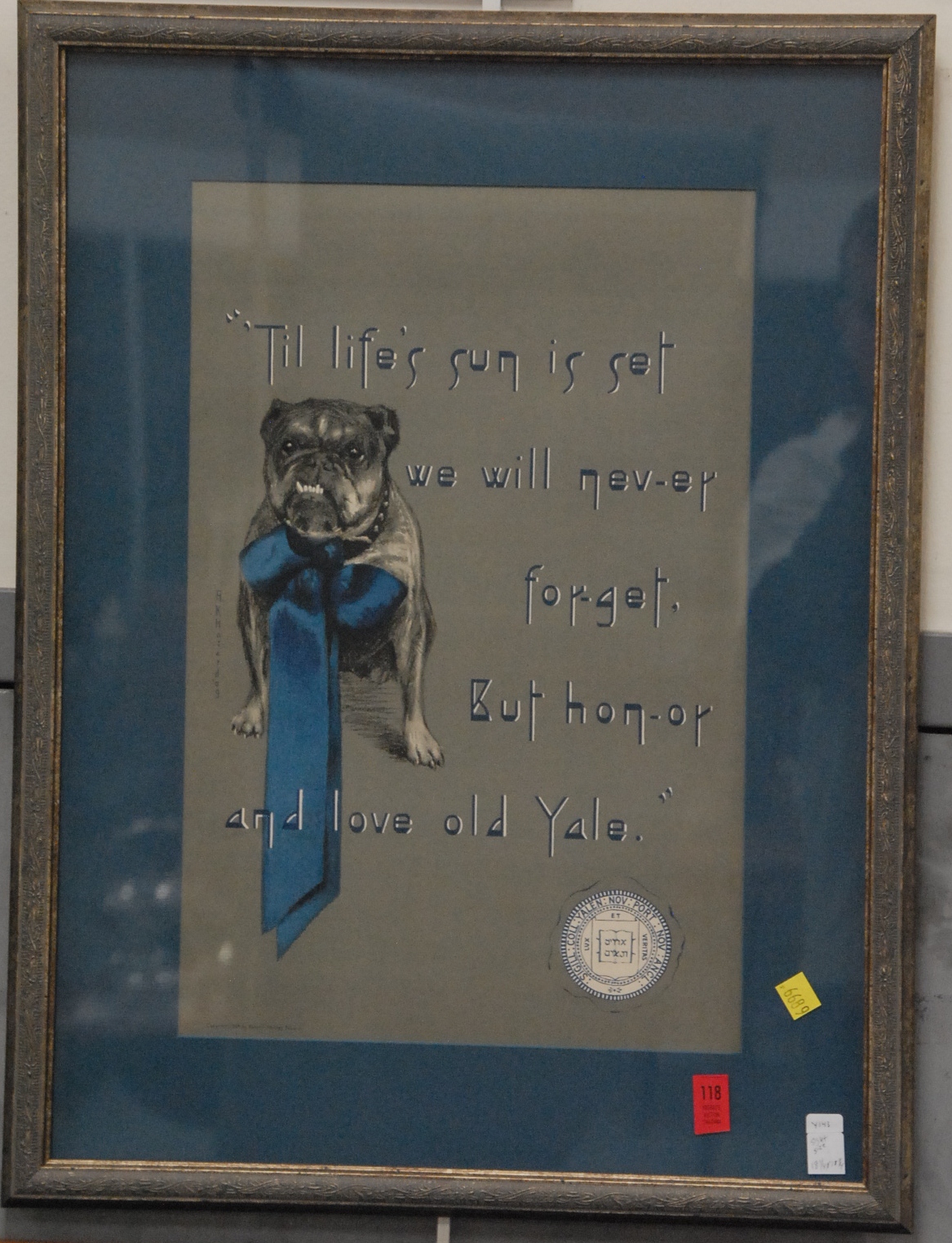 Six piece framed lot Yale University seal signed Colonna from ‘Yale A Portrait’ 2000, English Bulldog ‘Handsome Dan’ signed E H Hart in plate circa 1940, Handsome Dan lithograph with Y circa 1890-1900 in original oak frame, Yale Bulldog lithograph signed Dennis in plate circa 1940, Handsome Dan Hold ‘Em Yale A B Graves 1890 reproduction, and Handsome Dan Well Rowed Yale A B Graves1890 reproduction, 17 1/2 x 13 1/2, 15 x 10, 15 x 10, 8 x 10, 9 x 7 & 5 1/4 x 5 1/4.