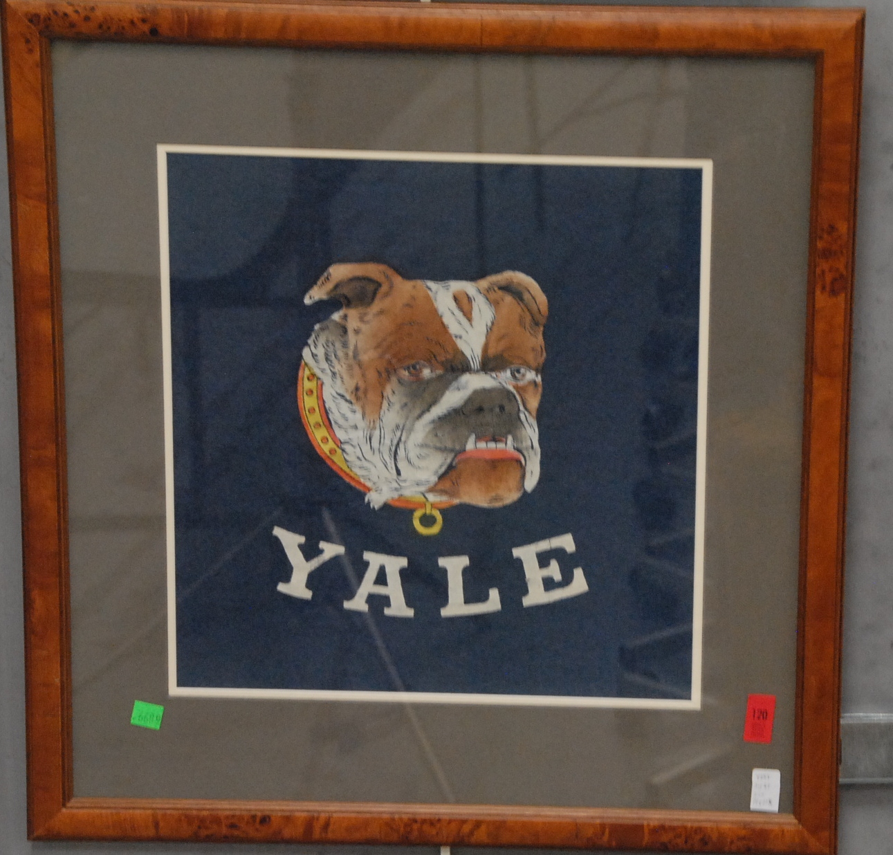 Two piece lot Yale English Bulldog colored lithograph pencil signed Falla Stock Doolittle circa 1980-1990 and Yale felt with three color bulldog circa 1930’s, 14 x 13 3/4 and 9 1/4 x 12 1/2 sight size.