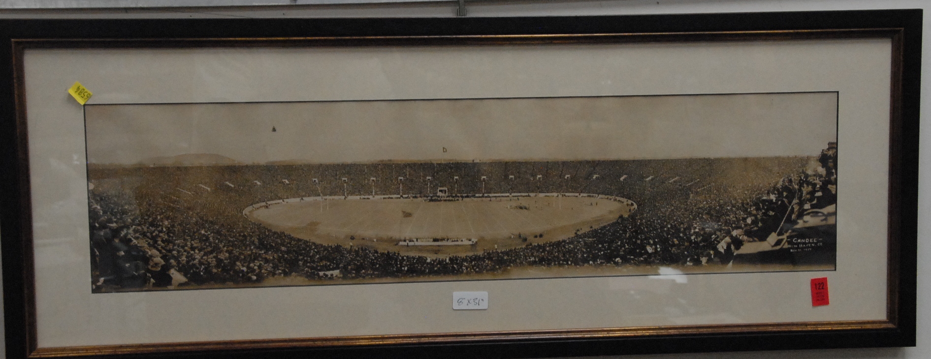 Three piece framed lot Yale Stadium pennant sewn vintage lettering circa 1900-1910, Yale felt pennant stylized lithographed bulldog circa 1905- 1915, 14 x 34 & 16 1/2 x 34, and New Haven Harbor Map.