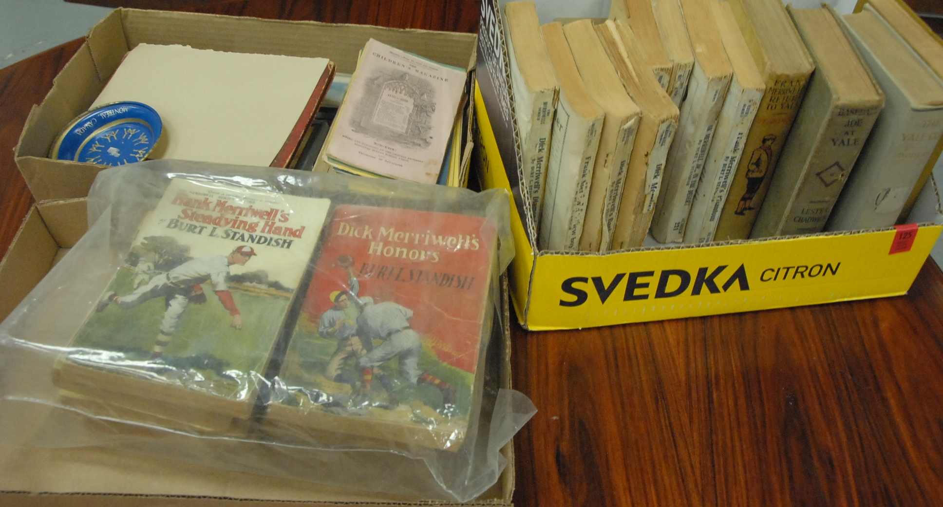Three boxes of books included paperbacks Dick Merriwell’s baseball books, Frank Merrywell’s Farm, 19th century children’s magazines, and miscellaneous.