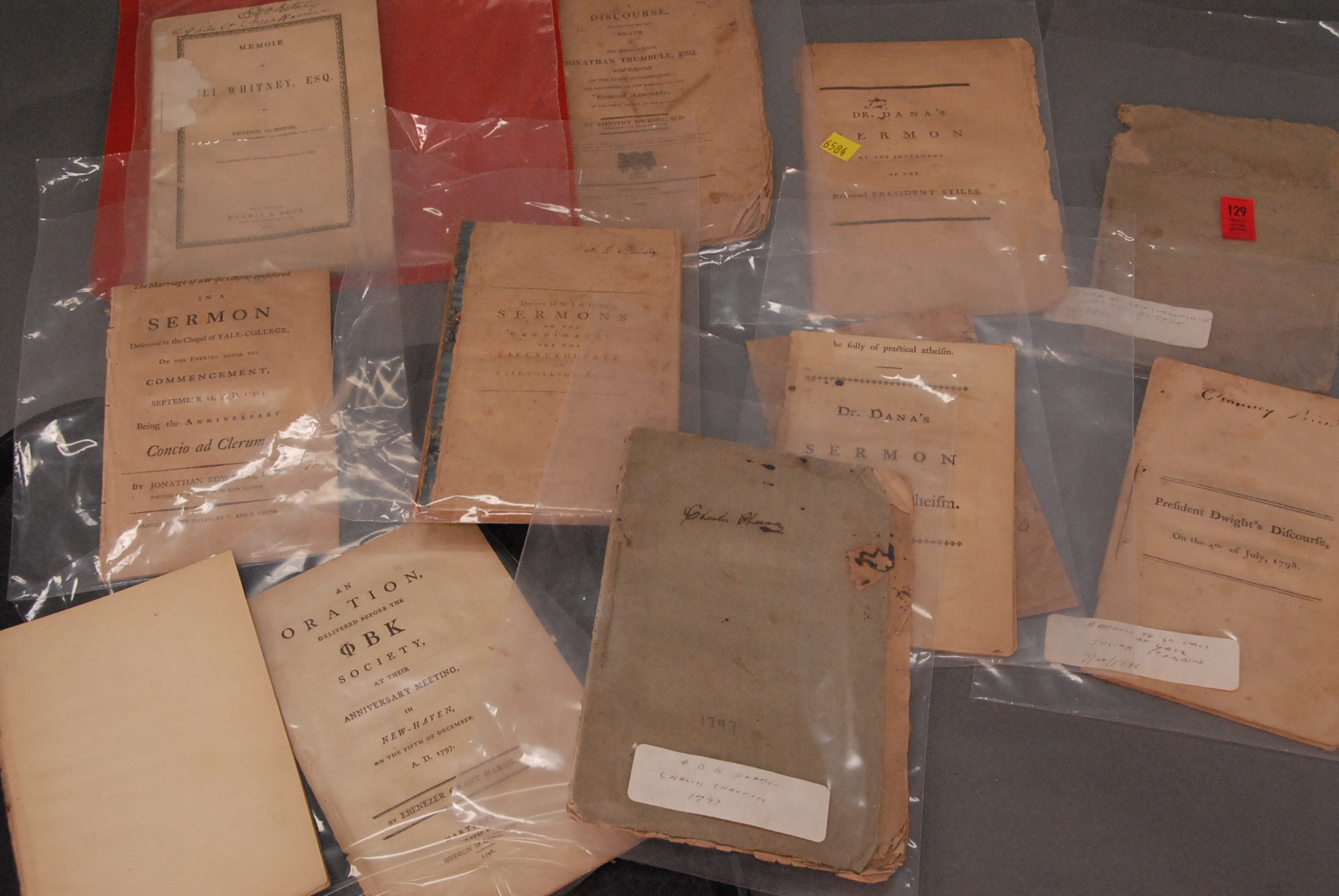 Twelve piece lot of Yale ephemera including Address to the Senior Class 1796, President Dwight’s Discourse 1798, Dr. Dana’s sermon 1794, Dr. Dana’s sermon at the intermitten at the Reverend President Styles 1795, Poems at Yale Commencement Warren Dutton 1800, Eli Whitney Memoirs signed by Whitney’s son 1846.
