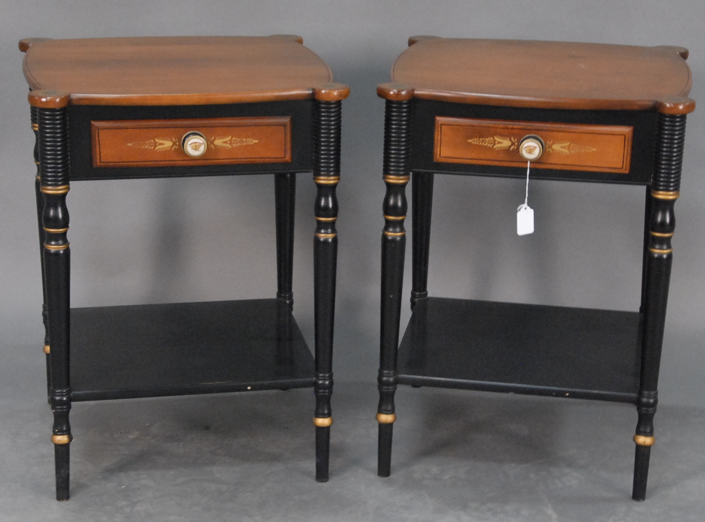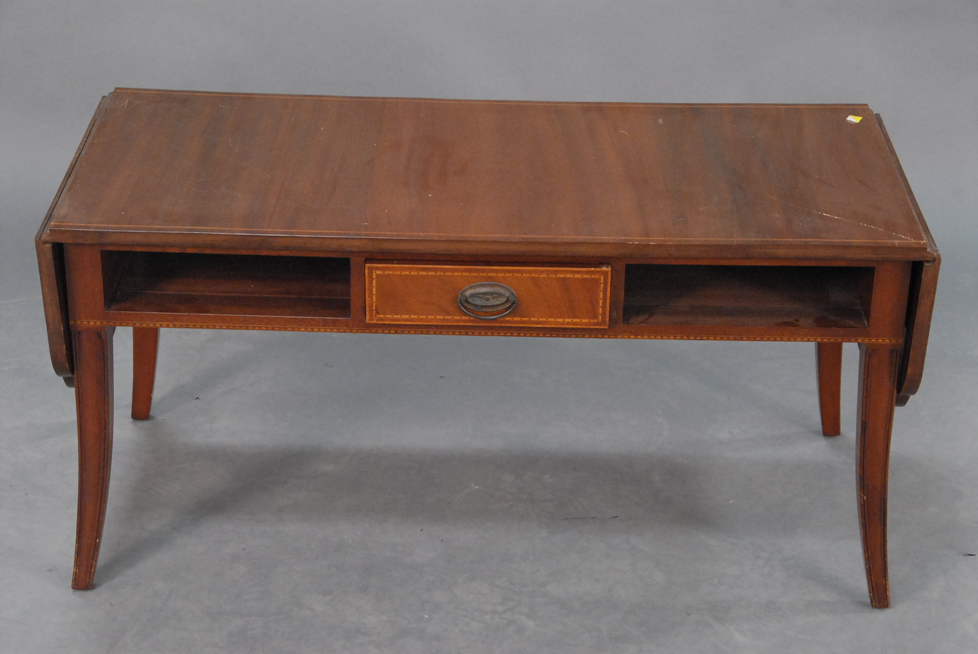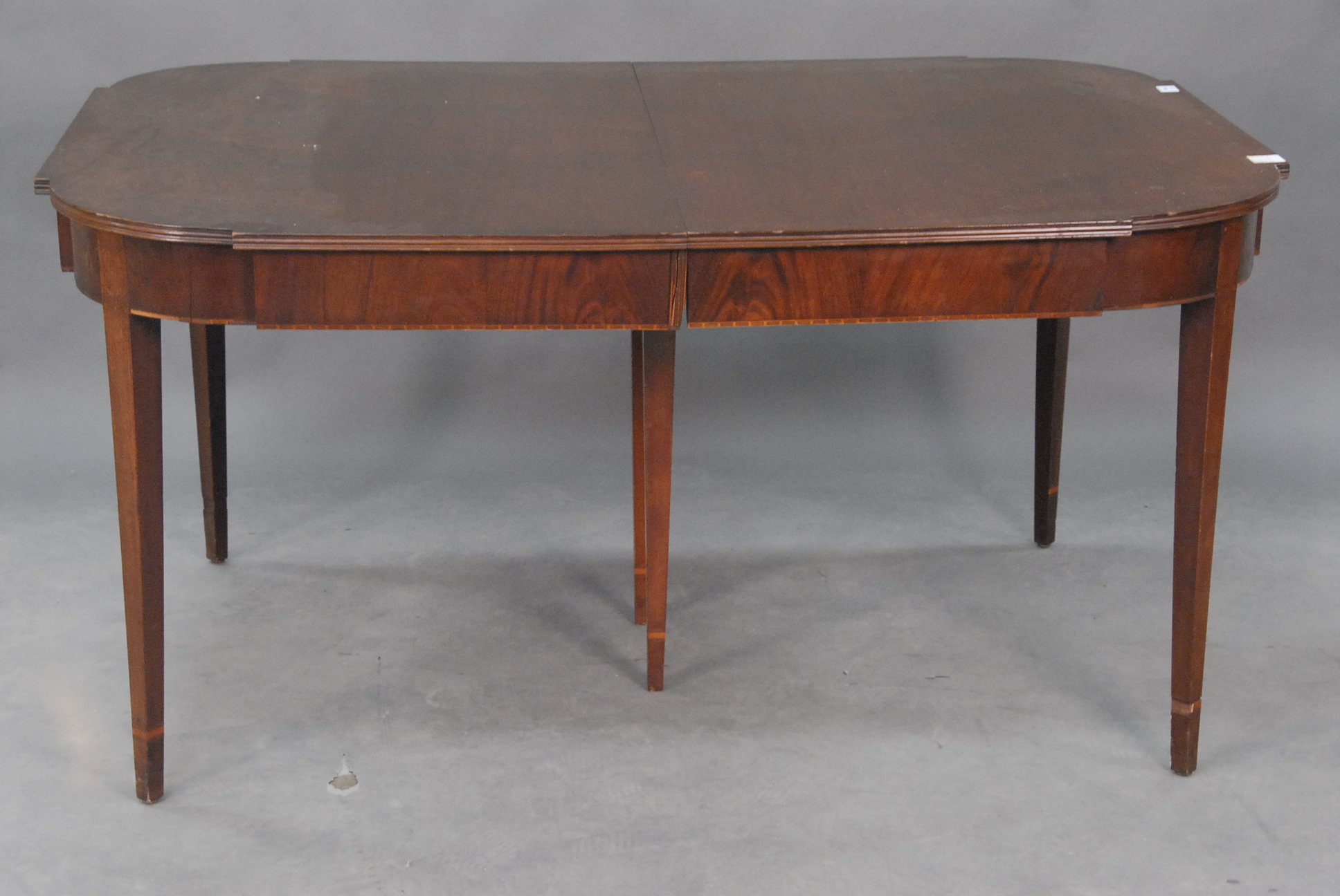 Margolis mahogany Federal style dining table with D shaped ends and conforming inlaid frieze with panel and icicle inlaid legs. ht. 30in. lg. 67in. with four 12 inch leaves, total open lg. 115in.